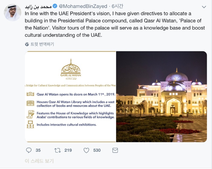 | [아부다비] UAE 대통령궁, 3월 11일부터 일반인들을 위한 유료 관광코스로 부분 개방한다! (0) | 2019.03.05 |