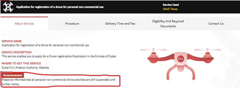 ** 현재 민간항공청 (GCAA) 및 두바이항공청 (DCAA)에서는 일부 개인 드론유저들의 불법 사용이 적발된 후 상업용 드론 외에 개인 및 비상업용 드론 사용 및 등록이 무기한 전면 금지 중입니다.