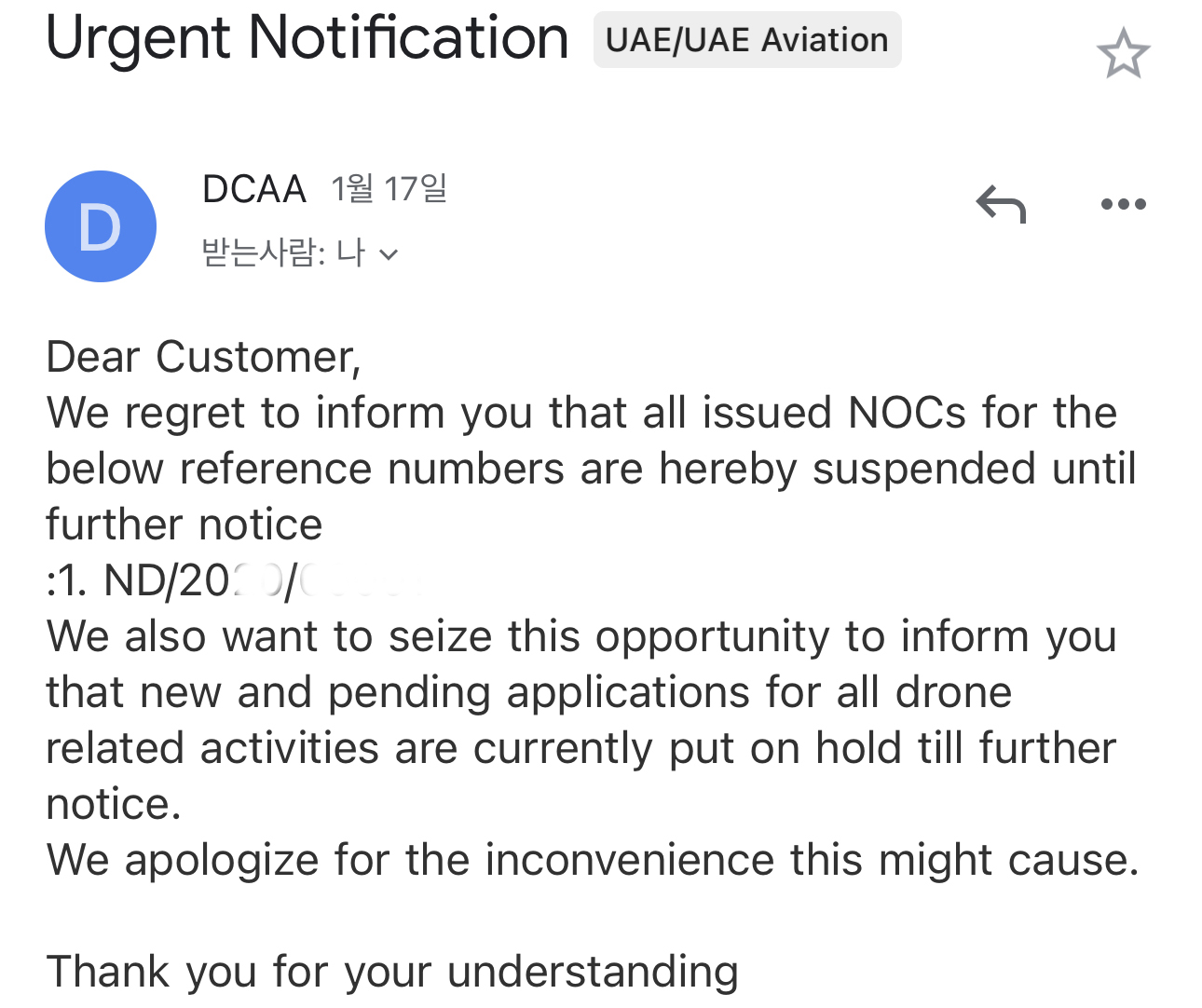 이와 관련하여 UAE 당국은 2022년 1월 17일 기발급된 등록서를 무기한 무효화하고 신규 등록 신청을 유예한다는 긴급 통보 메일을 등록한 유저들에게 발송한 바 있으며,