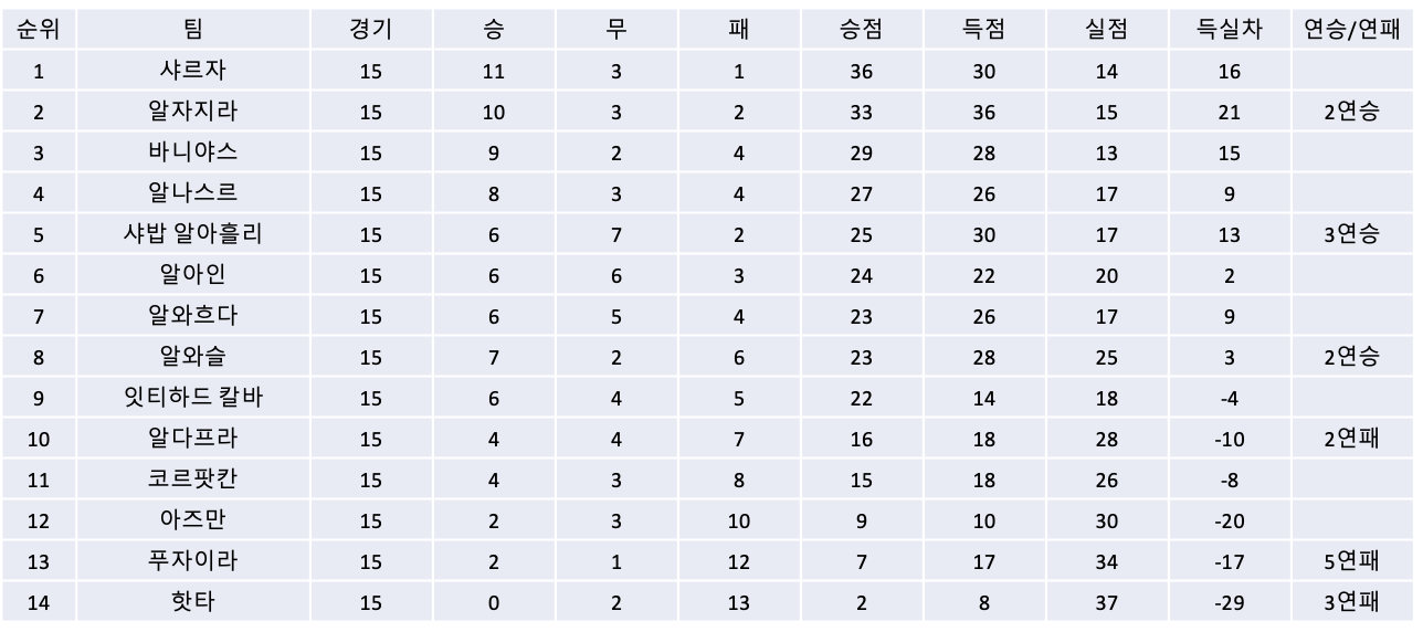 1) 알나스르는 15라운드를 앞두고 2019년 가을부터 팀을 맡아왔던 크루노슬라프 유리치치 감독을 경질하고, 알힐랄과 알잇티하드를 이끌었던 라몬 디아즈 감독을 새 감독으로 영입하고 15라운드는 대행감독 체제로 치뤘습니다. 그의 첫 경기는 16라운드부터입니다.