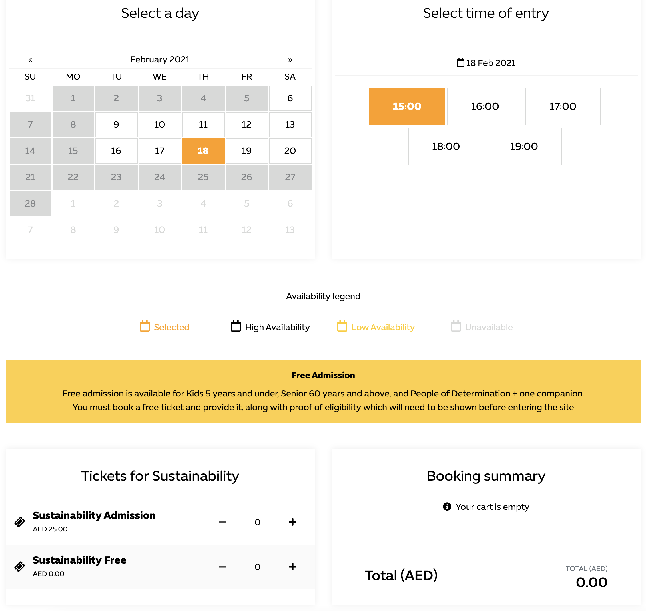 테마관 선공개 이벤트는 엑스포 공식 홈페이지에서 지정된 날짜에 한해 평일엔 오후 3시, 주말엔 오후 4시부터 예약이 가능하며 입장료는 25 디르함입니다. 단, 5세 이하와 60세 이상, 그리고 거동이 불편한 사람과 보호자는 무료.