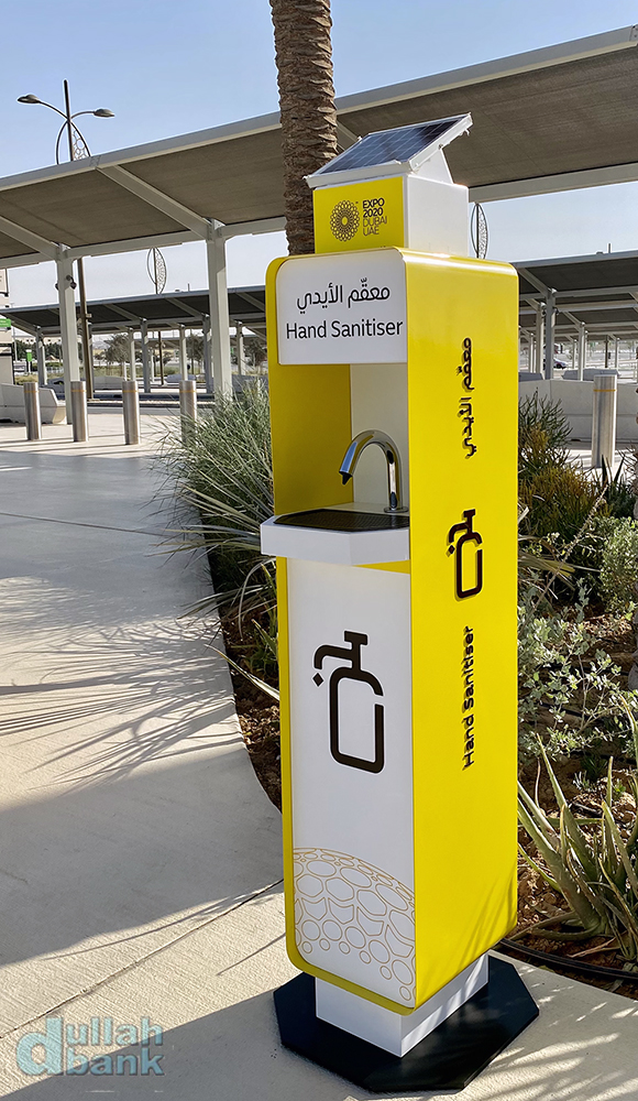 코로나 19의 여파로 인해 곳곳에 손세정기가 설치되어 있습니다. 태양광으로 자체적으로 전력을 공급받아 손만 대면 세정제가 뿌려지는 자동식 세정기입니다.