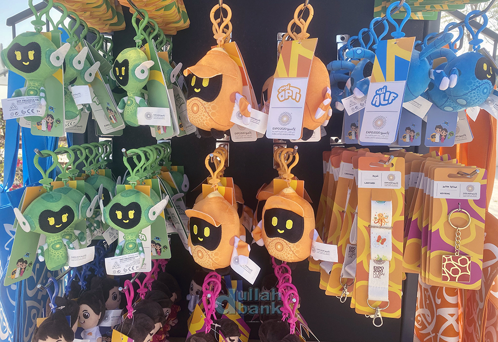 기념품점이니 만큼 두바이 엑스포의 마스코트도 찾아볼 수 있습니다. 라쉬드와 라티파의 가디언으로 녹색이 지속가능성을 상징하는 테라, 황금색이 기회를 상징하는 옵티, 그리고 이동을 상징하는 파란색의 알리프.