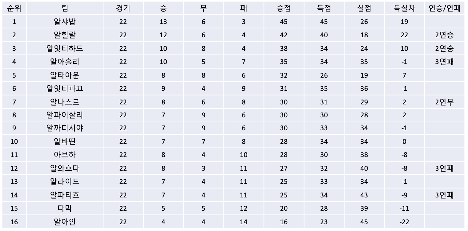 5) 반면, 알아흘리는 전반기에 패했던 강등권의 다막과의 경기에서 전반에 언어낸 선제골을 지키지 못하고 후반에 세 골을 허용하며 1대3으로 완패하며 3연패에 빠졌습니다. 알아흘리는 다막과의 맞대결에서 지난 시즌 이후 3연패를 당하며 예상치 못한 천적관계가 맺어지고 있으며, 다막은 리그 5승 중 2승을 알아흘리를 상대로 얻어내며 쉽지 않은 강등권 탈출에 사력을 다하고 있습니다.