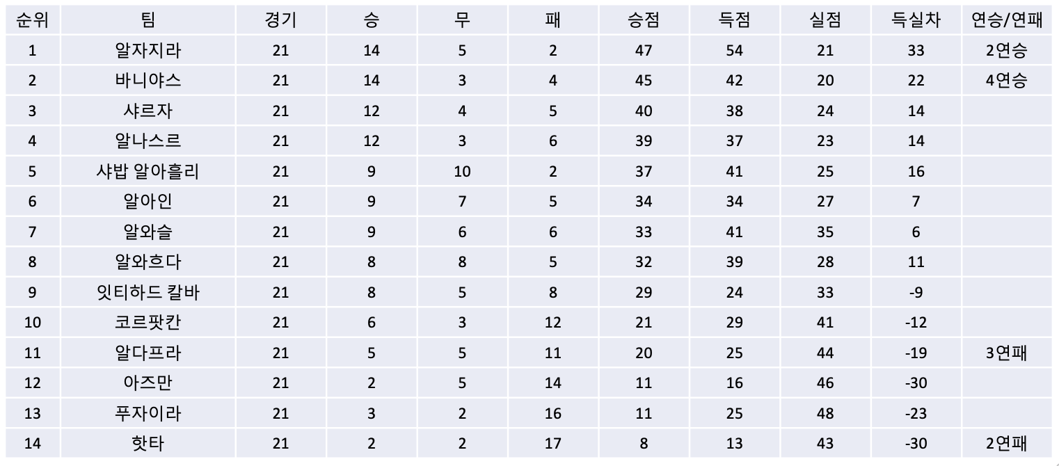 4) 알자지라가 승리한 사이 승리가 절실했던 샤르자는 카를로스 에두아르도에게 허용한 선제골을 만회하지 못하고 1대0으로 패하면서 알자지라와의 승점차가 7점차로 벌어지며 사실상 우승 경쟁에서 멀어지고 있습니다. 반면, 두 경기 연속 무승부 끝에 승리를 기록한 샤밥 알아흘리는 무패행진을 이어가며 3위 샤르자와의 승점차를 3점차로 줄이며 3위권을 넘보고 있습니다.
