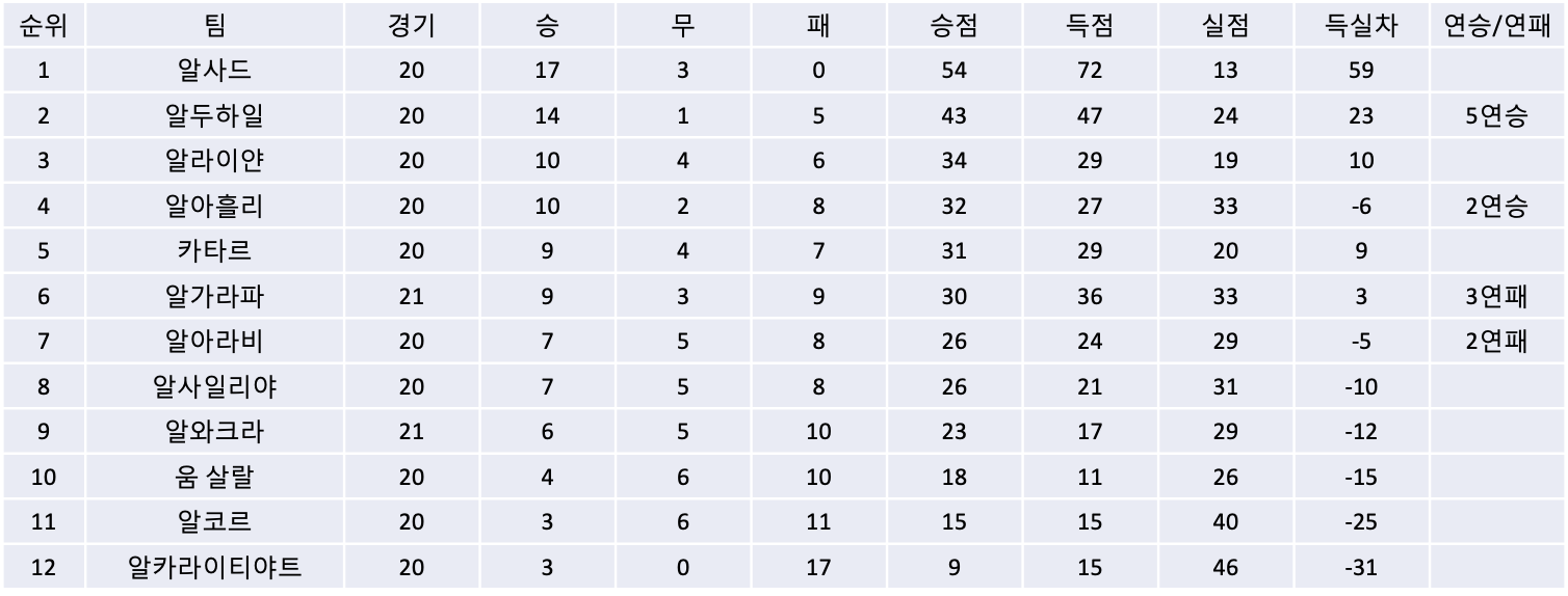 4) 리그컵 결승에서 알사일리야에게 완패하며 준우승에 만족해야만 했던 알라이얀은 강등권 탈출이 시급한 움 살랄에게 먼저 3점을 실점한 후 퇴장으로 인한 수적 우세를 앞세워 맹추격했지만 결국 승부를 뒤집지 못하고 리그 4연승 달성에 실패해 리그 3위 자리도 안심할 수 없는 상황에 빠졌습니다.