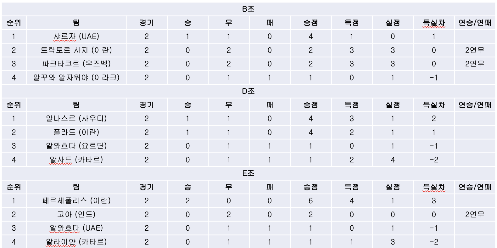 B-2) 처음 맞대결을 펼친 트락토르 사지와 샤르자의 경기는 득점없이 비기면서 2라운드가 끝난 현재 유일한 승리를 기록한 샤르자가 선두에 나섰습니다.
