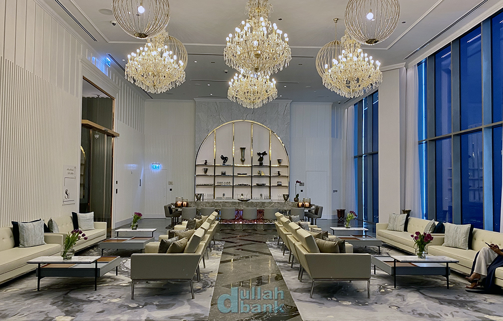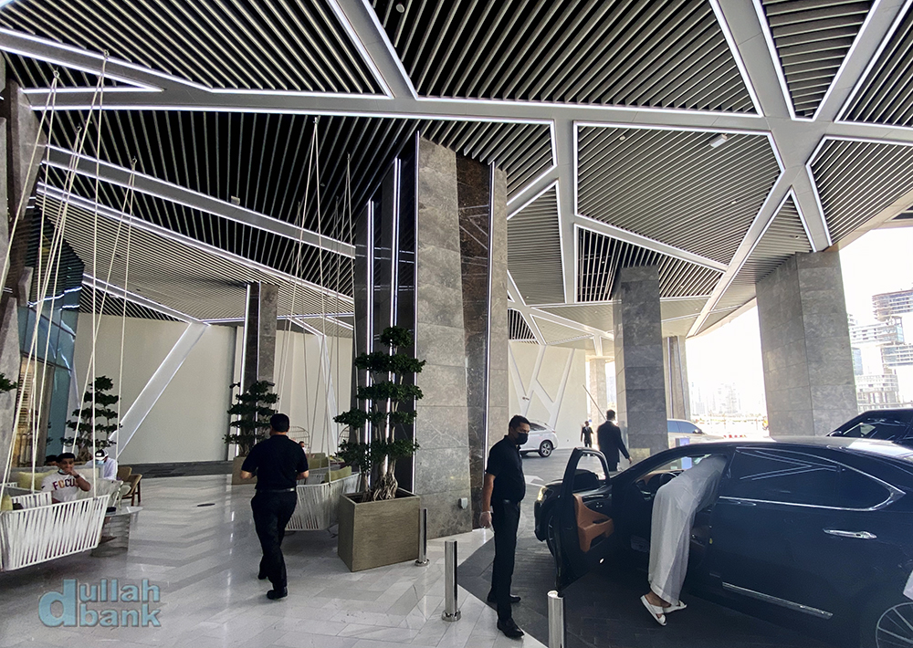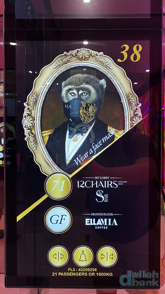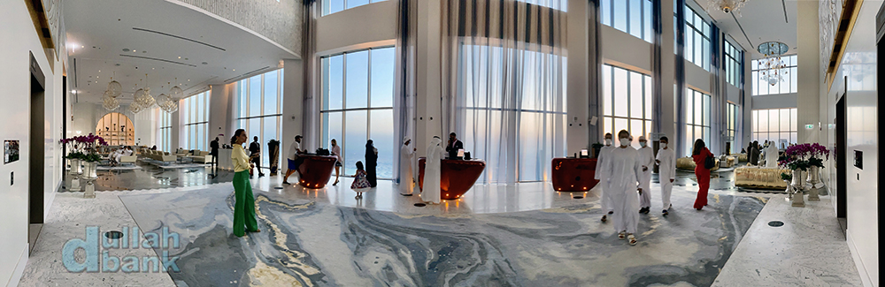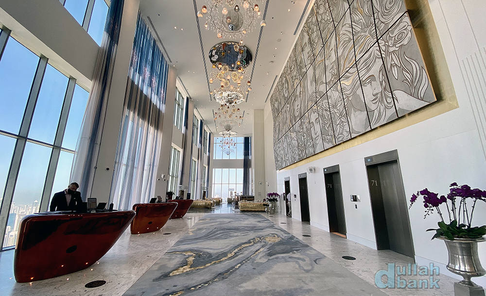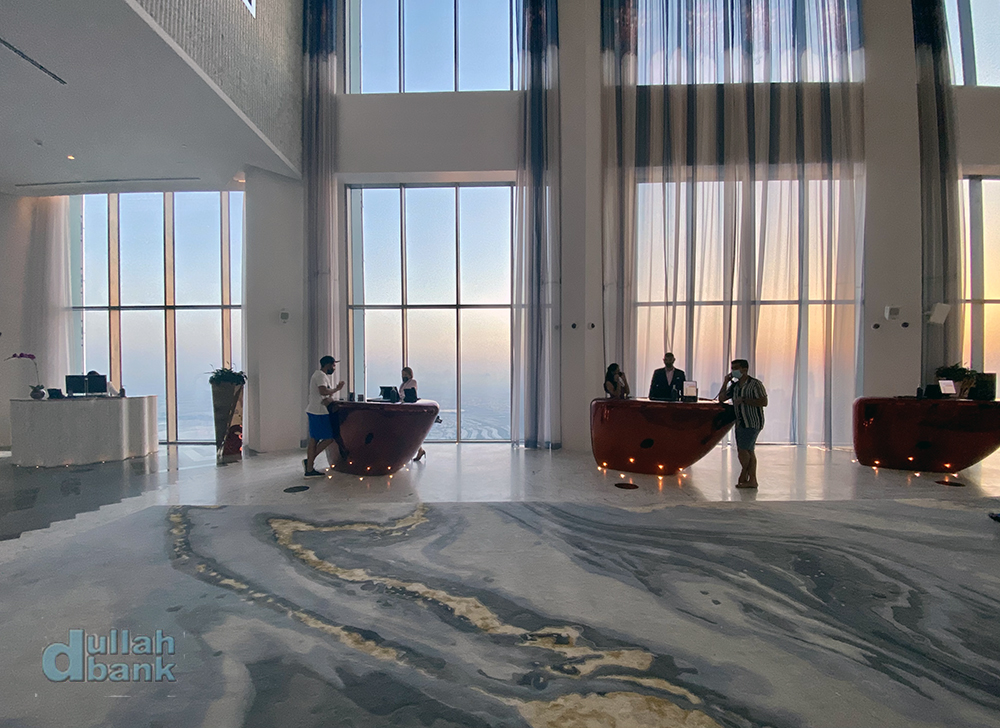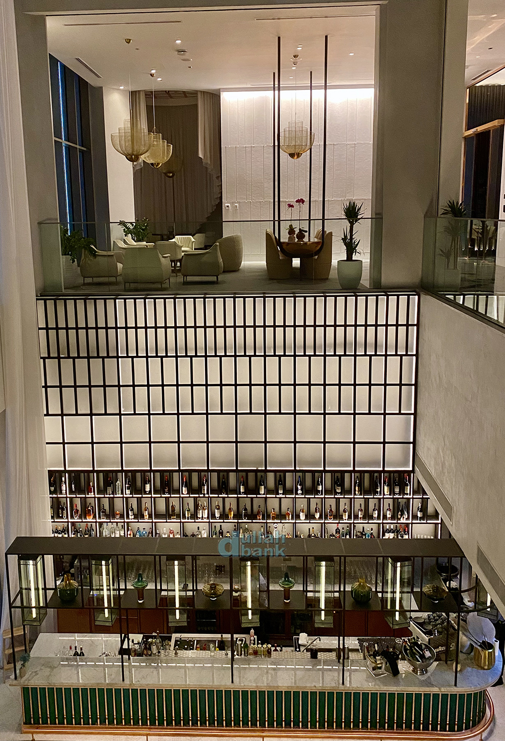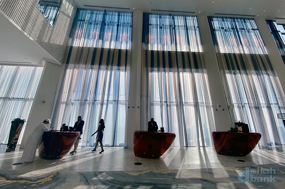 호텔 입구가 초썰렁한 이유는 SLS 두바이가 세계에서 가장 높은 탑5 호텔 중 유별난 동선을 가지고 있기 때문입니다. 특이하게 리셉션부터 F&B, 풀 등 일반적으로 저층부에 두는 모든 공용 구역을 크라운이라 부르는 300미터 위에 위치한 최상단 69~75층에 집중시키고, 그 밑으로 58~67층은 호텔, 허리에 해당하는 35~56층은 호텔 아파트, 그리고 포디엄부터 33층까지는 레지던스에 할당시켰습니다. 밑에서 체크인하고 올라가는 것이 아니라, 일단 위로 올라가서 내려가는....공간 구성을 180도로 뒤집어 놓은 셈이죠. 호텔 투숙객의 동선으로만 따지면 컵을 뒤집어 놓은 느낌이랄까요?