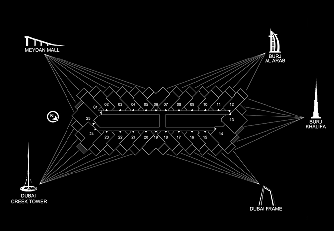 4개의 다른 축을 향해 45도로 기울여서 객실을 비대칭으로 조합했기 때문입니다. (이 4개의 축 중 메이단 몰은 현재 건설 중이고, 두바이 크릭 타워는 코로나로 인해 현재 보류 중입니다.)