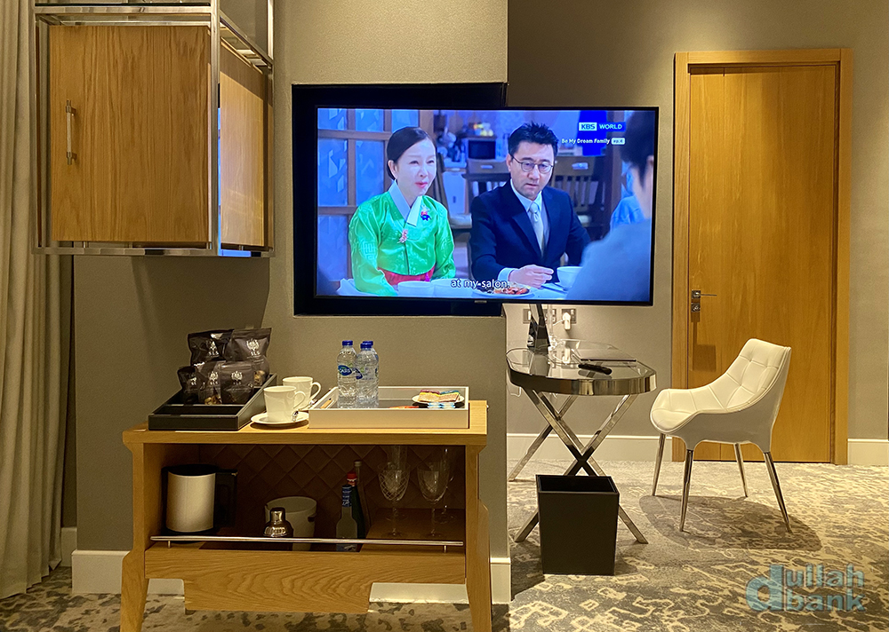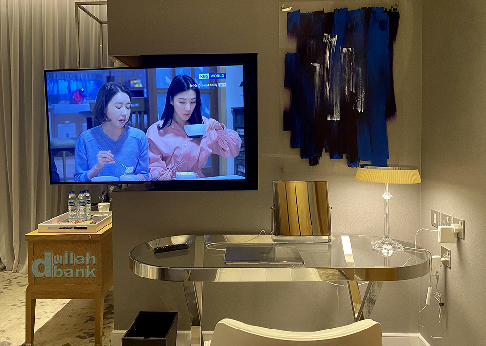 정말 특이하게도 벽 모서리에 엇박으로 걸려 있는 티비로는 KBS 월드를 볼 수 있습니다.