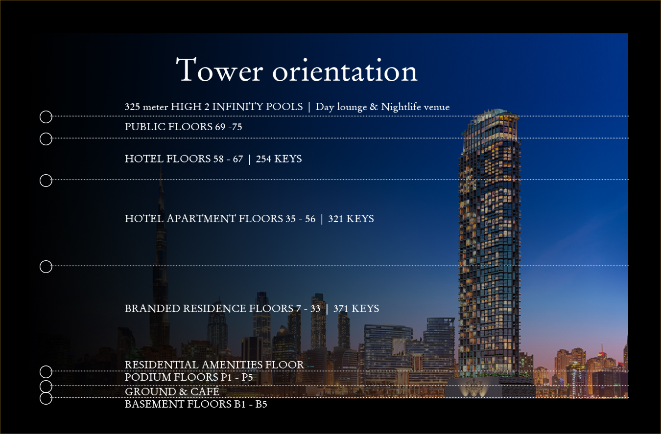 현존하는 세계에서 가장 높은 건물인 부르즈 칼리파 내에 있는 아르마니 호텔 두바이가 이 리스트에 포함되지 않는 것이 이상하다 싶겠지만, 실제로 부르마니는 부르즈 칼리파의 저층부에 자리잡고 있기에 각종 기록을 보유한 부르즈 칼리파와 달리 이 분야에서는 명함도 내밀 수 없습니다.