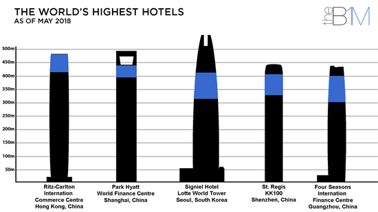 1992년 이후 평양의 류경호텔 (330m)이 오랫동안 세계에서 가장 높은 호텔에 이름을 올렸지만, 2007년 로즈 레이한 바이 로타나 (330m)가 그 기록을 깬 후 주목받기 좋아하는 두바이가 이 분야 기록 갱신에 앞서기 시작해 2012년 비즈니스 베이에 JW 메리어트 마르퀴스 두바이 (355.4m), 2017년 셰이크 자이드 로드에 제보라 호텔 (356.3m)가 잇달아 기록을 깨면서 탑 5 중 네 곳의 호텔이 두바이에 자리잡게 되었습니다. 중국에 있는 호텔들 사이에 시그니엘 서울이 3위로 끼어있는 가장 높은 곳에 위치한 호텔처럼, 이 분야의 3위는 말레이시아에 있는 포 시즌스 쿠알라룸푸르 (343m)가 차지하고 있습니다.