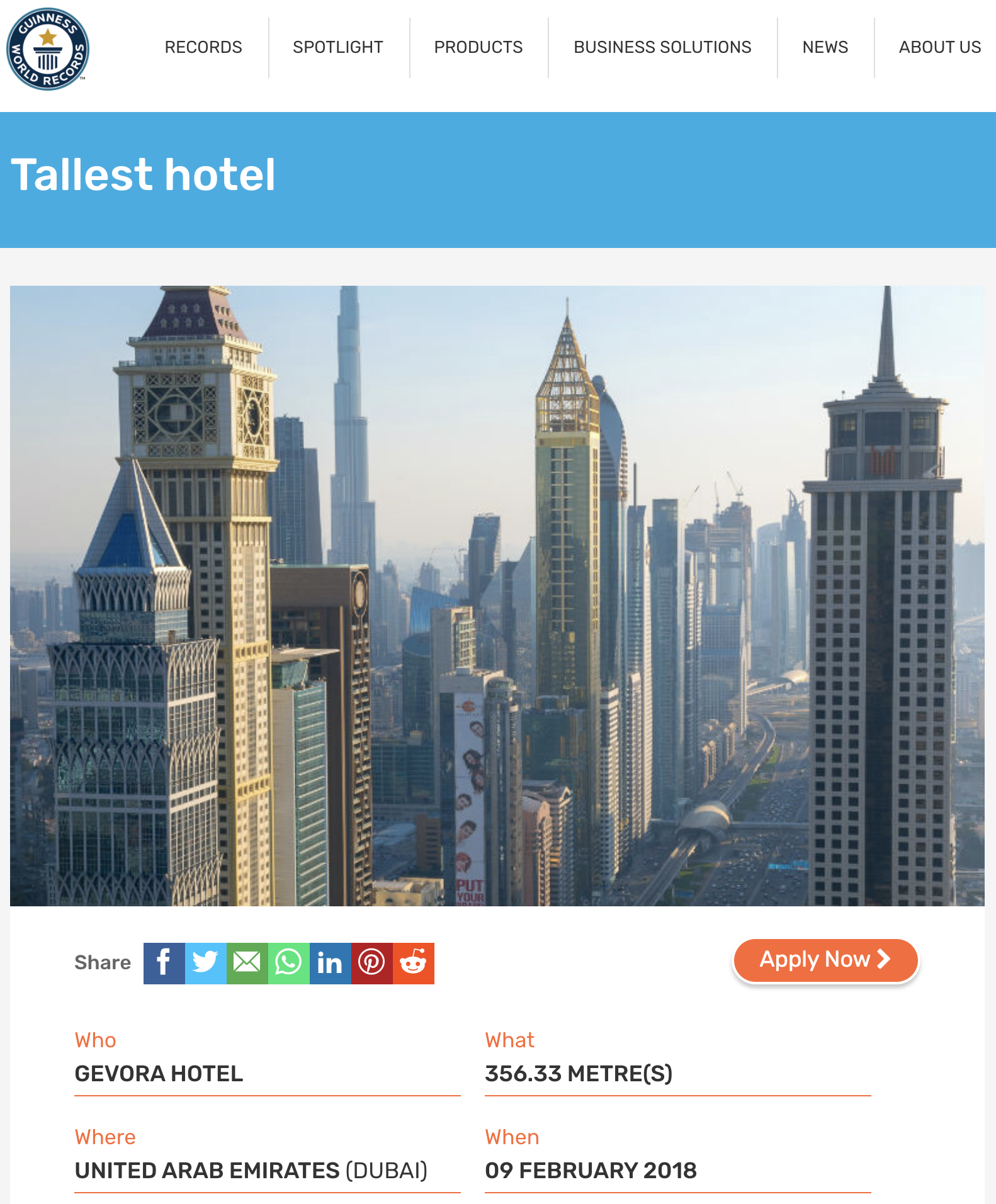 그리고 또 하나의 분야는 호텔 전용 건물로 세계에서 가장 높은 호텔 (Tallest Hotel). 2007년 이후 두바이가 초강세를 보이고 있는 이 분야는 순수 호텔 및 호텔 레지던스 전용으로만 사용되는 건물 중 초고층 호텔을 의미합니다. 초고층 건물 전체를 호텔, 호텔 아파트, 레지던스와 부대시설로만 채운 주거용 건물로만 활용하는 것은 디벨로퍼 입장에서도 리스크가 클 수 있을텐데도 불구하고, 화제성을 가져오기 쉬운만큼 남들이 안하는 분야에 볼거리를 만들어 관광객을 유치하는 두바이 입장에선 매혹적일테니까요.