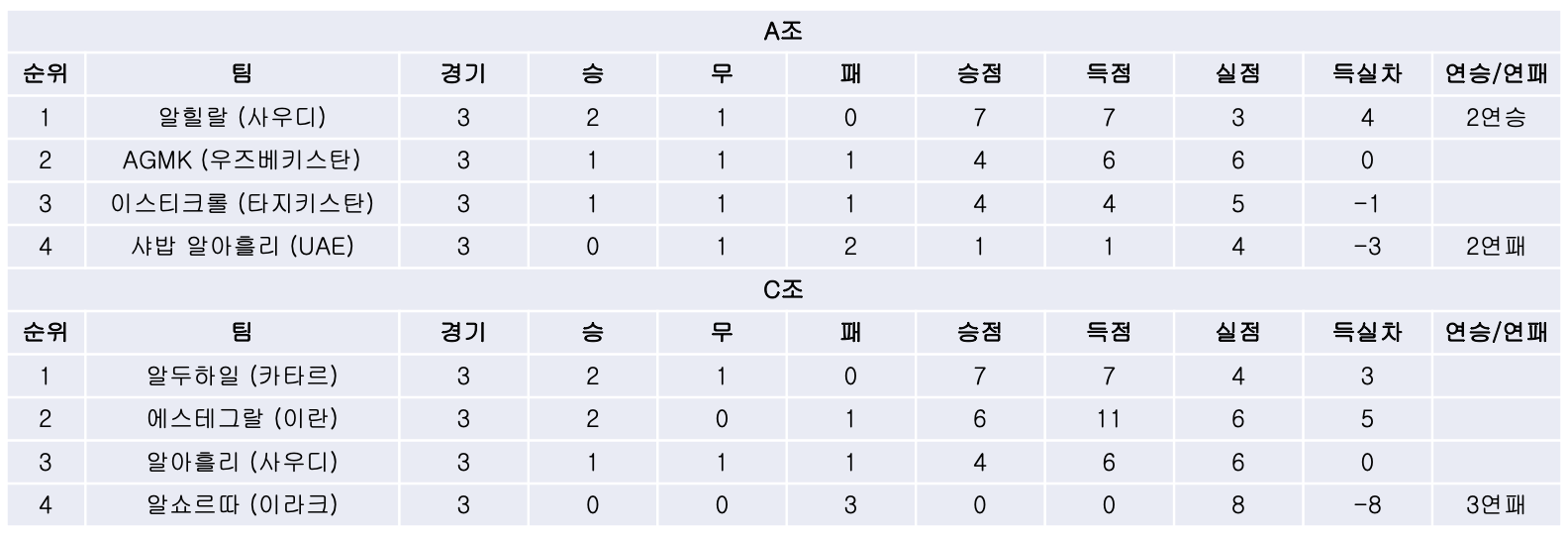 C-2) 지난 시즌에 이어 2년 연속 조별예선에서 맞붙은 알쇼르따와 알아흘리의 경기에서는 압둘라 타르민의 결승골을 앞세운 알아흘리가 0대3 완승을 거두고 첫 승을 기록했습니다. 알아흘리는 지난 두 라운드까지 기록한 모든 골의 주인공 오마르 알소마는 침묵했지만, 경기의 주도권을 내주고도 효율적인 공격으로 값진 승리를 거두었습니다.