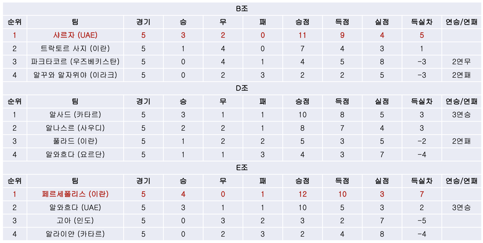 B-2) 샤르자는 첫 대결에서 승리했던 알꾸와 알자위야의 리턴 매치에서 역전에 역전을 거듭한 끝에 살림 살레의 결승골로 2대3으로 승리하며 최종 라운드 결과와 상관없이 5개조 중 가장 먼저 조1위를 확정지으며 높은 승점으로 조2위가 되도 16강 진출이 확실한 페르세폴리스에 이어 두번째로 16강 진출을 확정지었습니다. 샤르자는 조별예선을 통과해 8강에 진출했던 2004년 이후 17년 만에 조별예선을 통과했습니다. 지역 구분없이 진행되었던 당시에는 8강전에서 성남 일화와 맞붙어 충격과 공포의 2연패 (6-0/5-2)로 4걍 진출에는 실패했습니다. (성남 일화는 준우승)