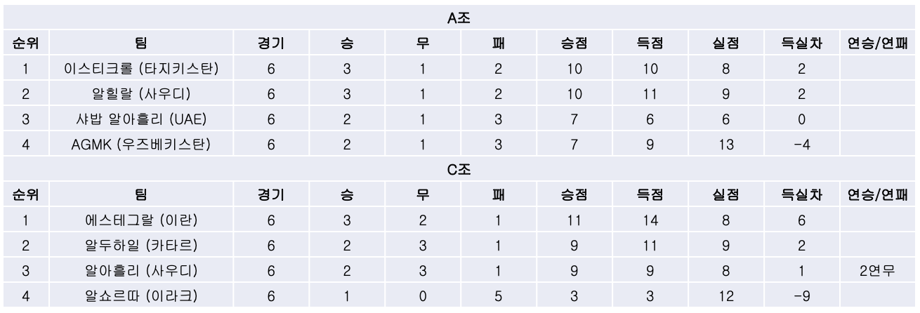 A-2) 이스티크롤은 첫 맞대결에서 난타전 끝에 승리했던 AGMK와의 마지막 경기에서 조반 도키치에게 결승골을 허용하며 1대2로 패했지만, 승점이 같았던 알힐랄이 샤밥 알아흘리에게 패하면서 처음 출전한 아챔에서 조1위로 16강에 진출하게 되었습니다.