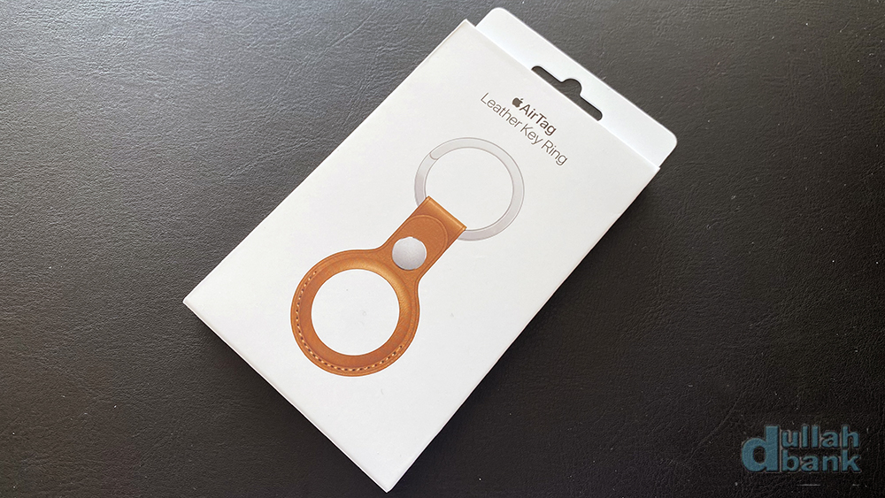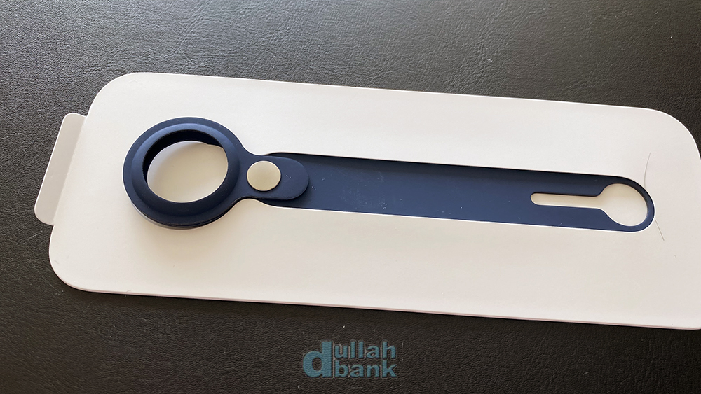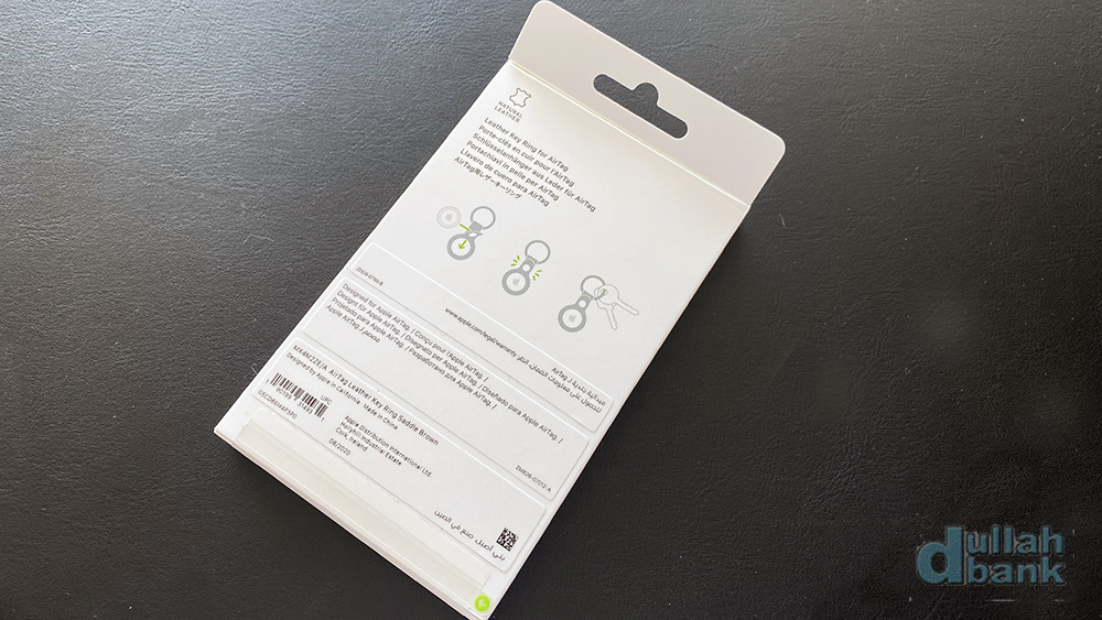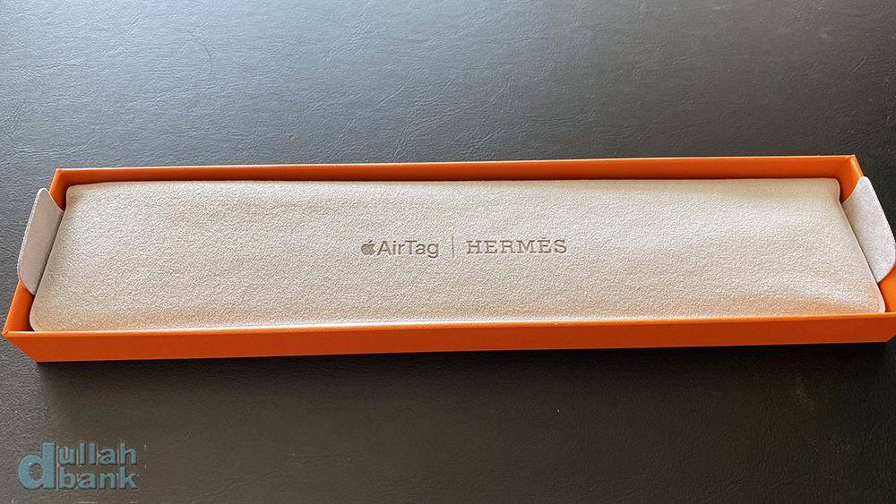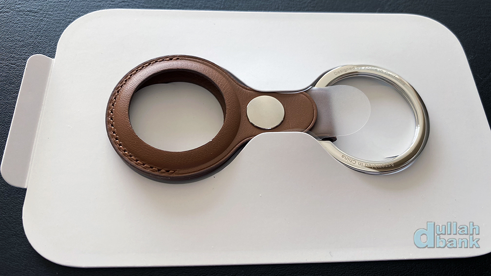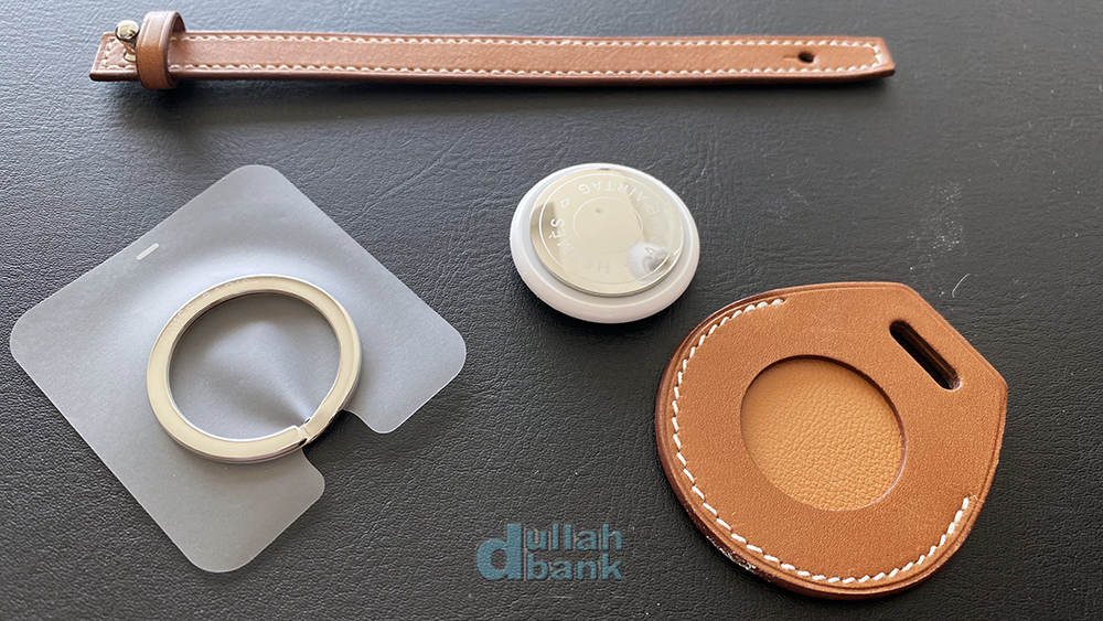 더스트백을 열면 3파트로 나뉘어진 가죽 키링과 에어태그가 들어있습니다.
