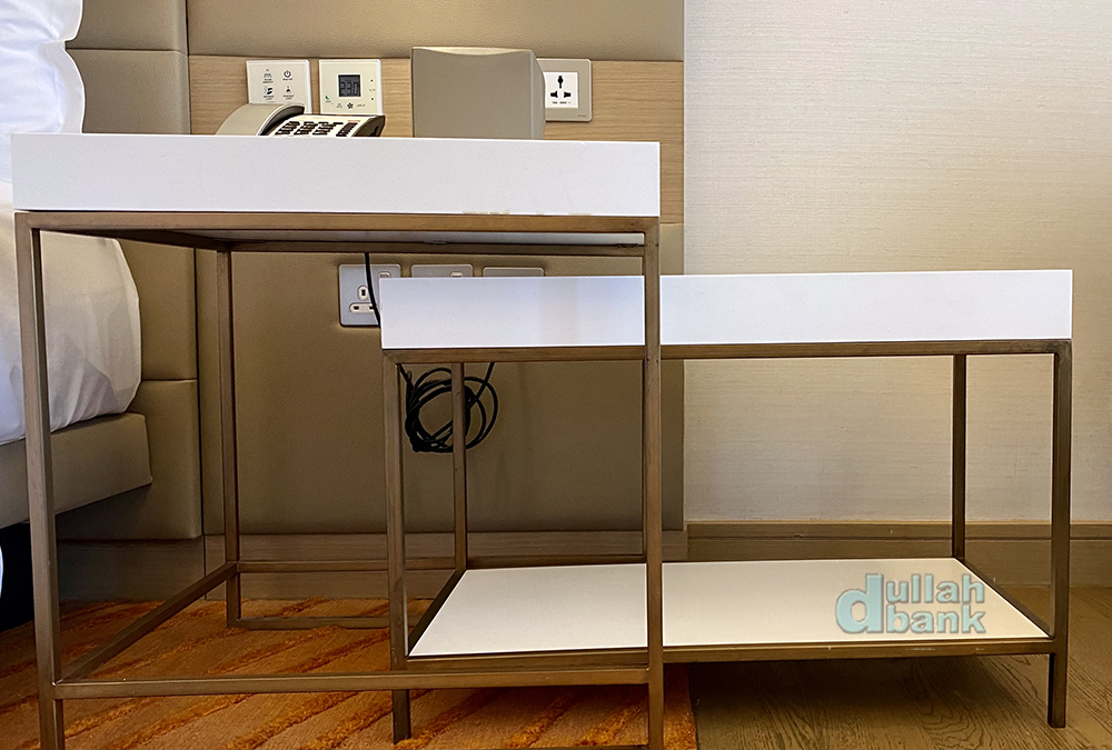 반대편에는 서랍 없이 선반에 올려놓을 수 있는 협탁 두 개가 자리잡고 있습니다.