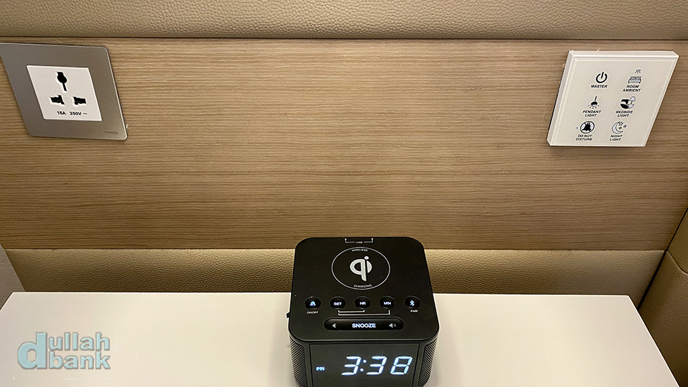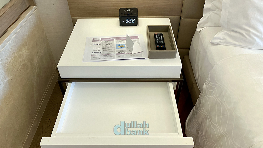 특색있는 점은 침대 좌우의 협탁이 비대칭으로 되어 있다는 점. 서랍이 있는 협탁은 한쪽에만 있으며,