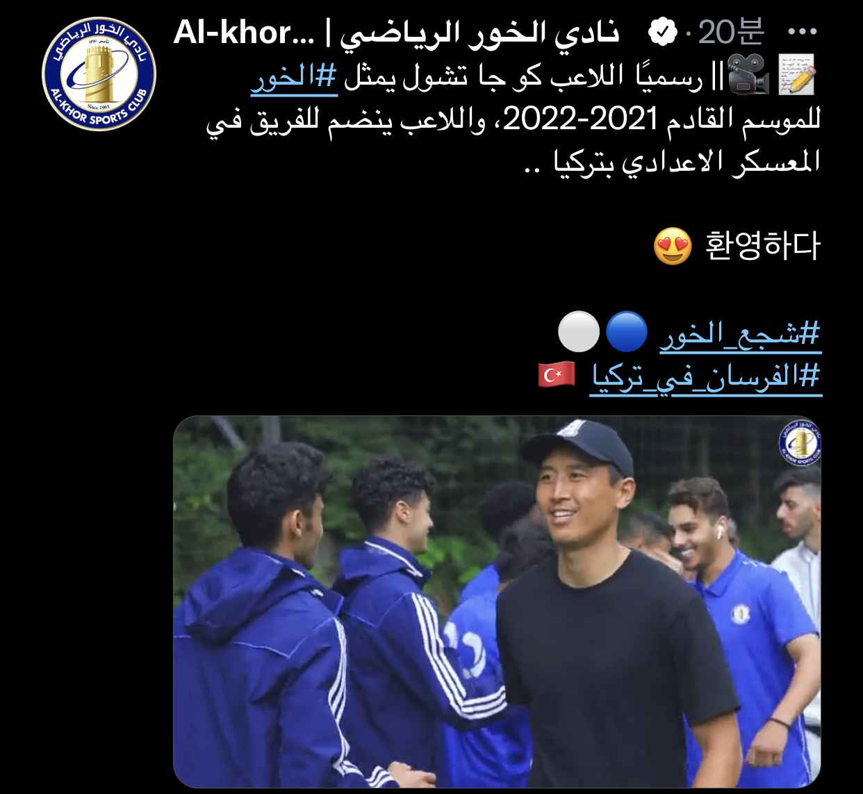 카타르 리그의 알코르는 구단 SNS계정을 통해 지난 7월 알가라파와의 계약이 종료되어 FA로 풀렸던 구자철이 터키에서 전지훈련 중인 선수단에 합류했다며 그의 영입 소식을 공식 발표했습니다.