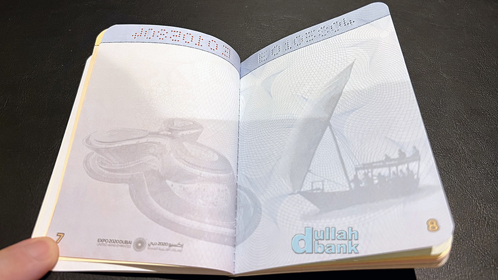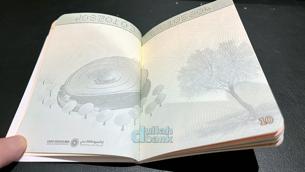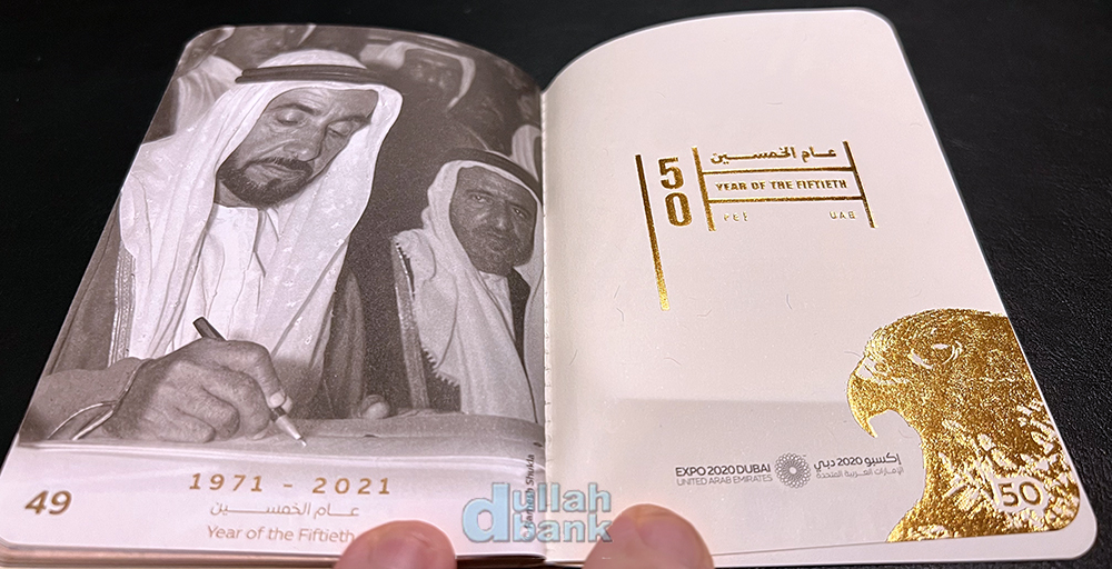 일정 패턴으로 반복되는 배경 그림을 감상하며 쭈욱 넘기다보면 49페이지에는 국부 셰이크 자이드가 1971년 12월 2일 여섯 토후국이 참가한 가운데 연합국 수립 협정서에 사인하는 순간의 사진과 함께 마지막 50번째 페이지엔 금박으로 올해의 모토인 국조 매와 함께 "UAE 건국 50주년의 해"를 안내하고 있습니다. 원래 의도한 바는 아니었지만 코로나19로 인해 1년 연기되면서 "지상 최대의 쇼"를 표방한 두바이 엑스포는 어저다보니 건국 50주년 기념일인 2021년 12월 2일과 맞물리게 되었죠.