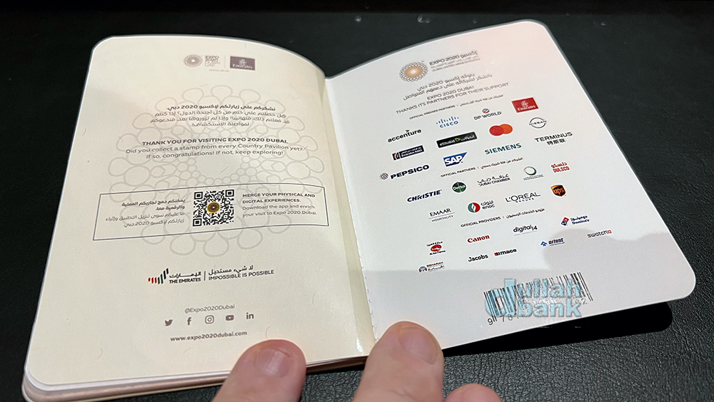 표지 뒷면에는 두바이 엑스포 로고와 메인 스폰서인 에미레이츠 항공 로고가 함께 소개되고 있습니다.
