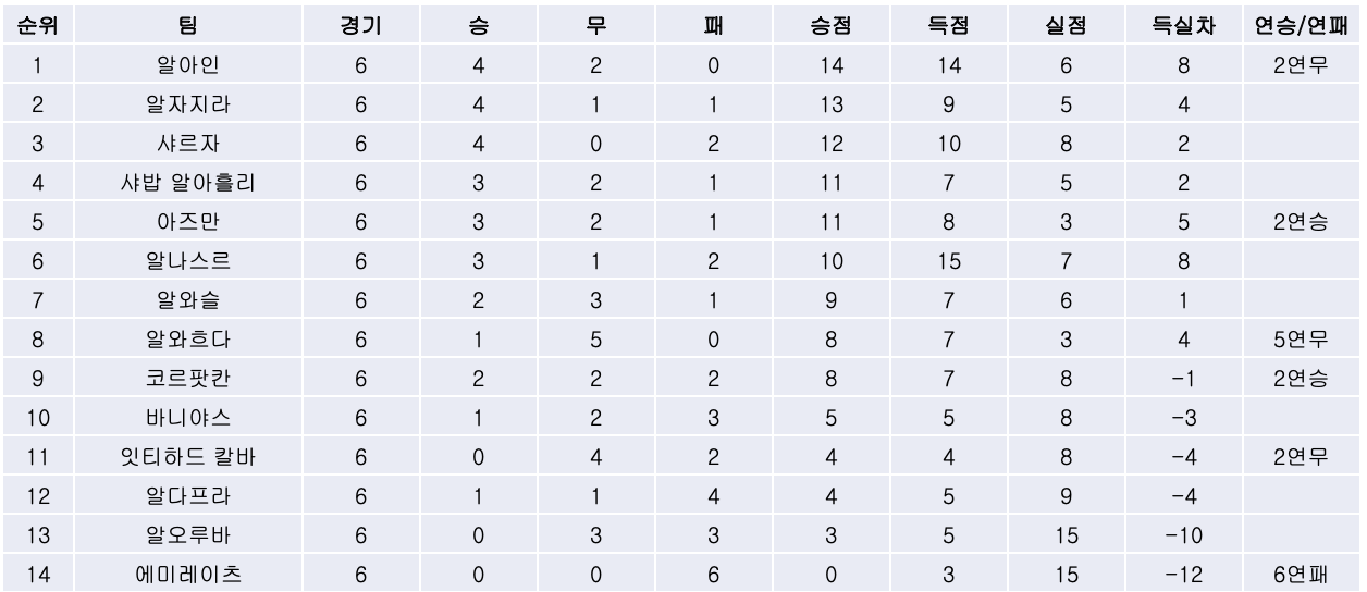 2) 5라운드까지 3개 무패팀 중 하나였던 샤밥 알아흘리는 알와슬과의 두바이 더비에서 1대0으로 패하며 시즌 첫 패를 당했으며, 알와슬은 3년 7개월여만에 샤밥 알아흘리와의 공식대회 맞대결에서 첫 승리를 거뒀습니다.