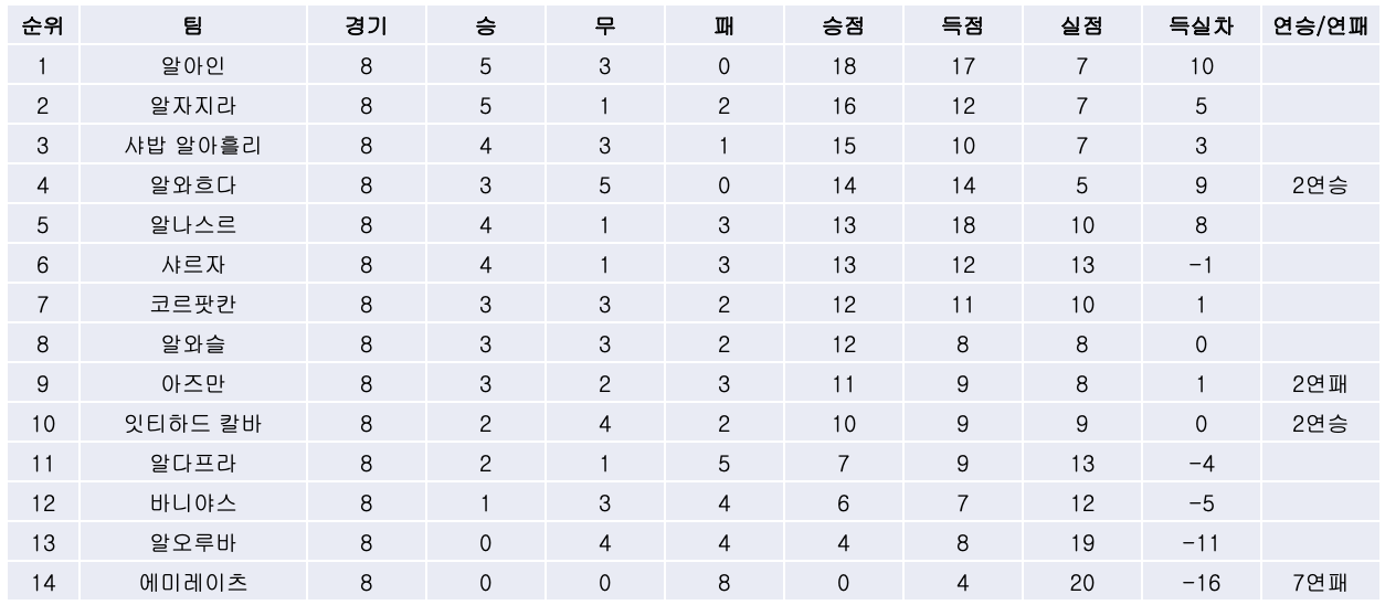 | [21/22 APL 10R] 나란히 무패행진을 이어가며 선두권을 형성한 알아인과 알와흐다, 부상에서 394일만에 돌아온 오마르 압둘라흐만! (0) | 2021.11.22 |