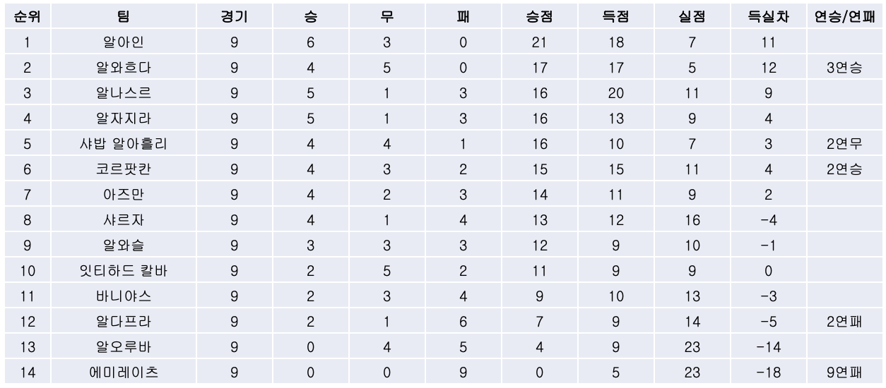 | [21/22 APL 10R] 나란히 무패행진을 이어가며 선두권을 형성한 알아인과 알와흐다, 부상에서 394일만에 돌아온 오마르 압둘라흐만! (0) | 2021.11.22 |