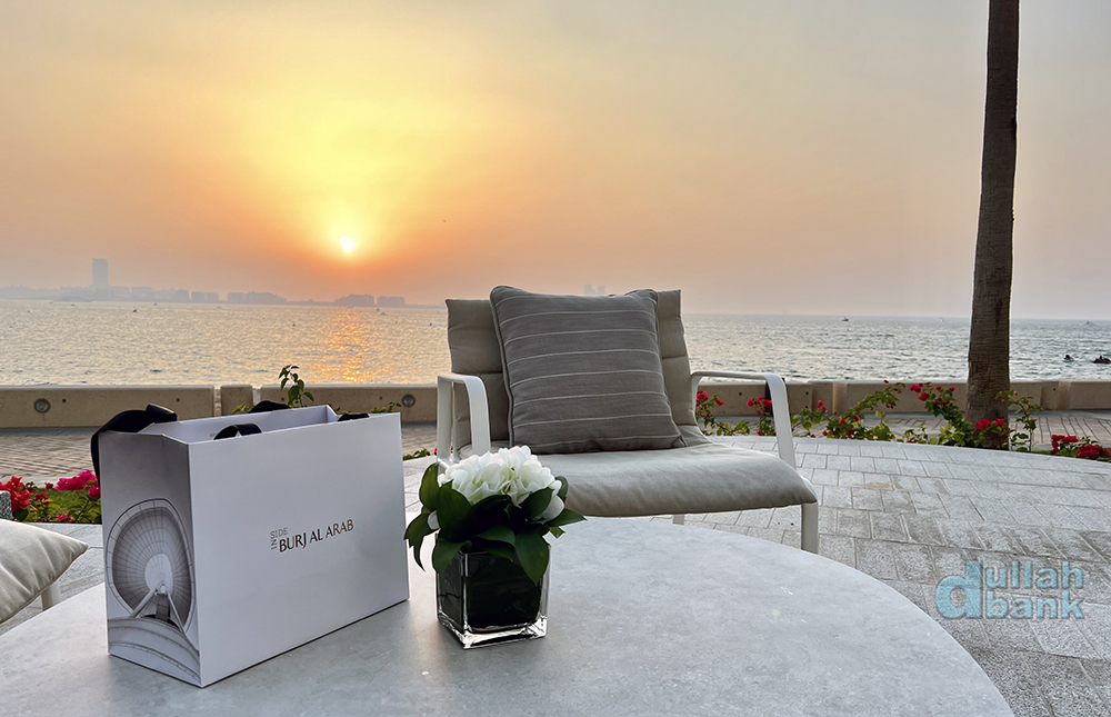 출구로 나오면, 인사이드 부르즈 알아랍 투어를 위해 새로 마련된 야외 라운지 우마가 있습니다.