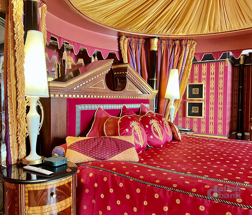 방 전체의 요란하고 화려한 색감은 셰이크 무함마드의 의중이 많이 반영된 결과물입니다. 주메이라 그룹이 부르즈 알아랍과 주메이라 비치 호텔을 짓고 있던 당시 40대 후반의 셰이크 무함마드 왕세제는 자신이 진행하는 첫 대형 프로젝트였던만큼 건설 현장을 시시때때로 찾아 진행상황을 확인하는 등 깊이 관여했다고 합니다. 당시 그를 모시는 곳에 있던 지인에 따르면 그가 새벽 2~3시에 불시에 현장을 방문할 때도 프로토콜에 따라 준비한 후 그를 맞이해야만 했기 때문에 수행직원들은 밤낮을 가리지 않고 긴장 상태였다고 하죠. 과장이 심하다 싶겠지만, 이런 그의 관리 스타일은 나이를 먹고 두바이 통치자가 된 후에도 이어져서 이른 아침 7시대에 두바이 정부 산하 사무실을 불시 시찰했다가 사무실에 아직 출근하지 않은 고위 관료들을 바로 해고시킨 바도 있습니다. 이르긴해도 출근시간이 지나 사무실을 방문했더니 벽에 걸린 자신의 초상화만이 자신을 맞이하고 있었다며 말아죠…