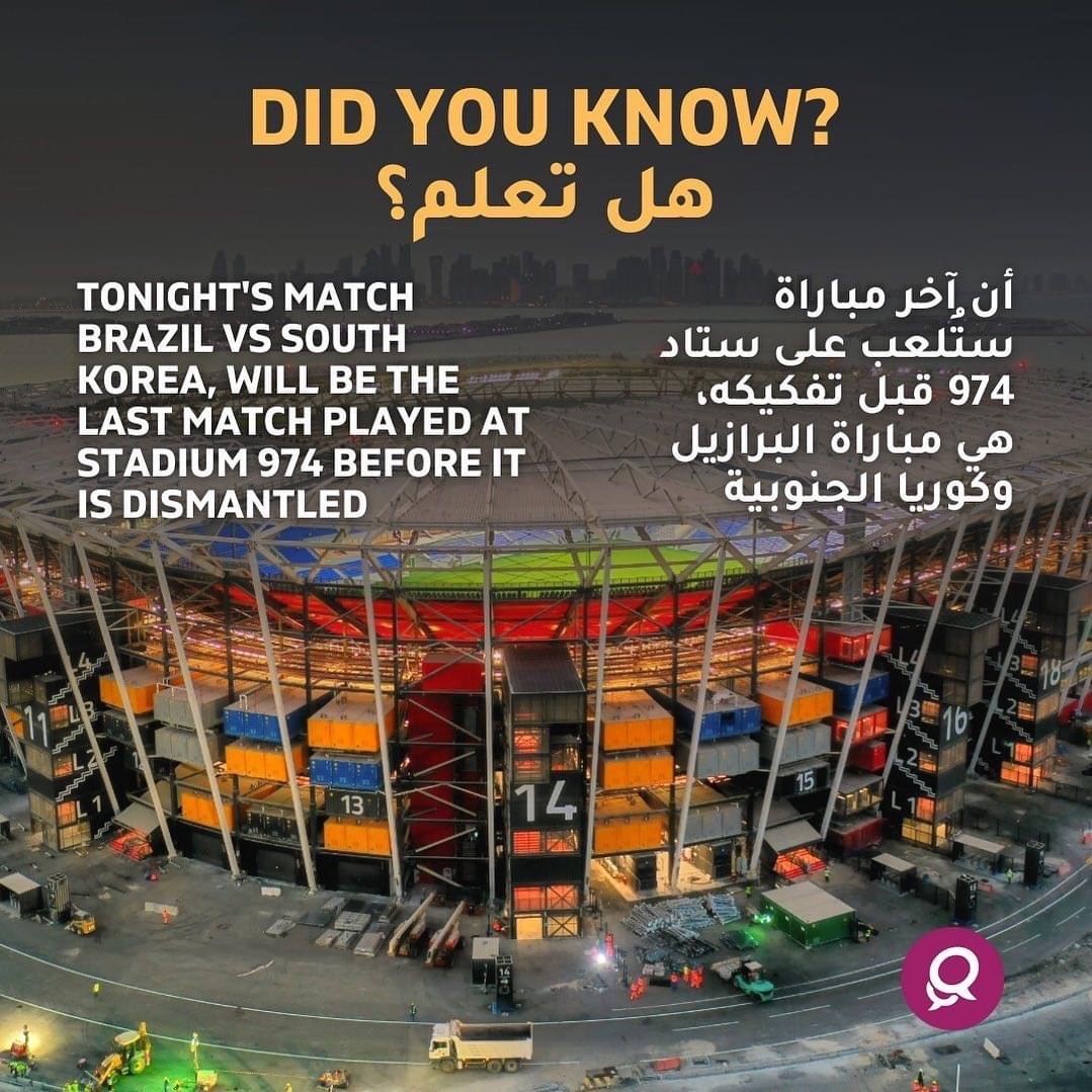 974 스타디움은 조별예선 네 경기와 준결승전, 3-4위전 등 여섯 경기가 열렸던 2021 FIFA 아랍컵에 이어 2022 카타르 월드컵 기간 중 조별예선 여섯 경기와 16강전 한 경기, 총 일곱 경기가 배정되었으며, 카타르 현지 시간 12월 5일 밤 10시에 펼쳐지는 한국과 브라질의 16강전이 974 스타디움 해체 전 열리는 마지막 공식 경기가 되었습니다.