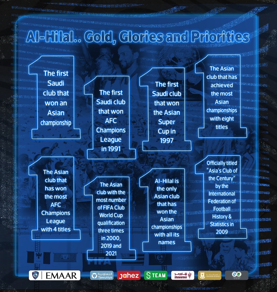 7) 알힐랄은 아챔 4회 우승을 포함 아시아 대륙 대항전에서 8번째 우승을 차지했습니다. (아시안컵 위너스 컵 2회, 아시안 슈퍼컵 2회)