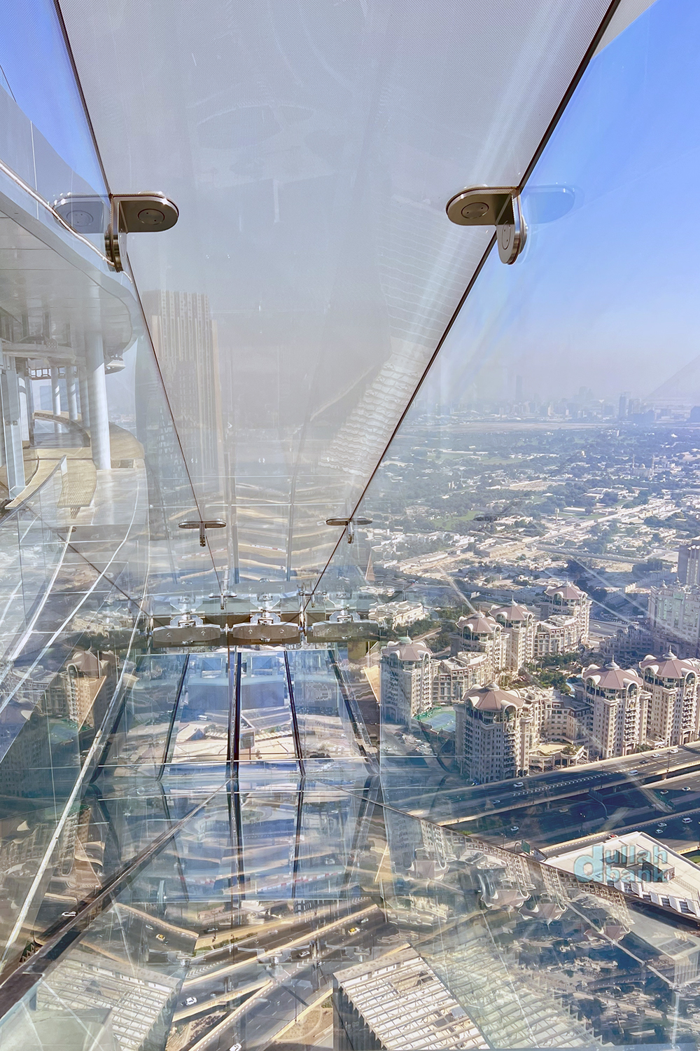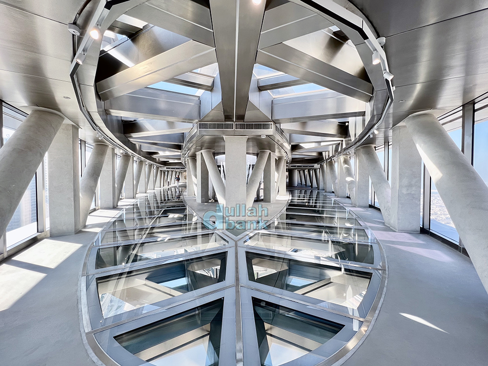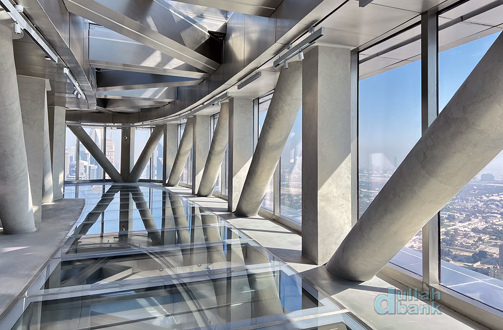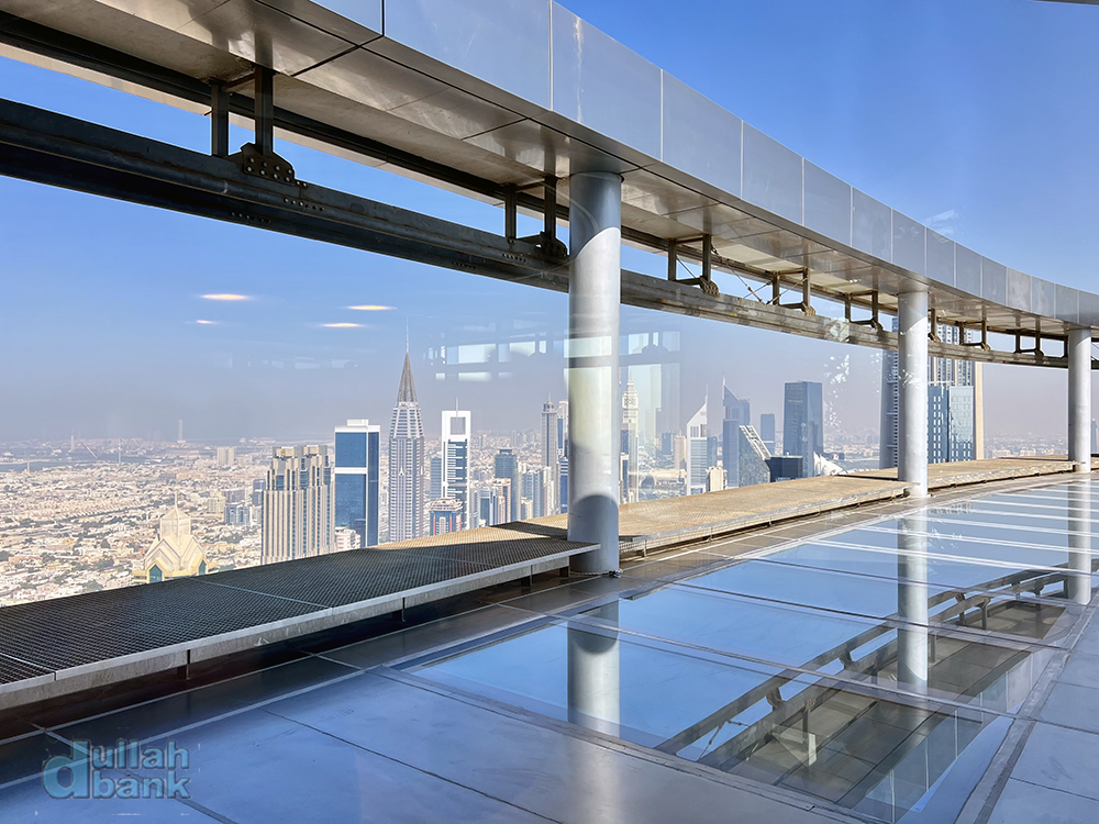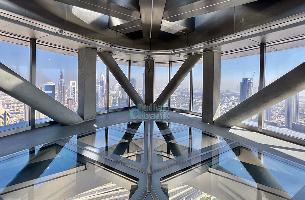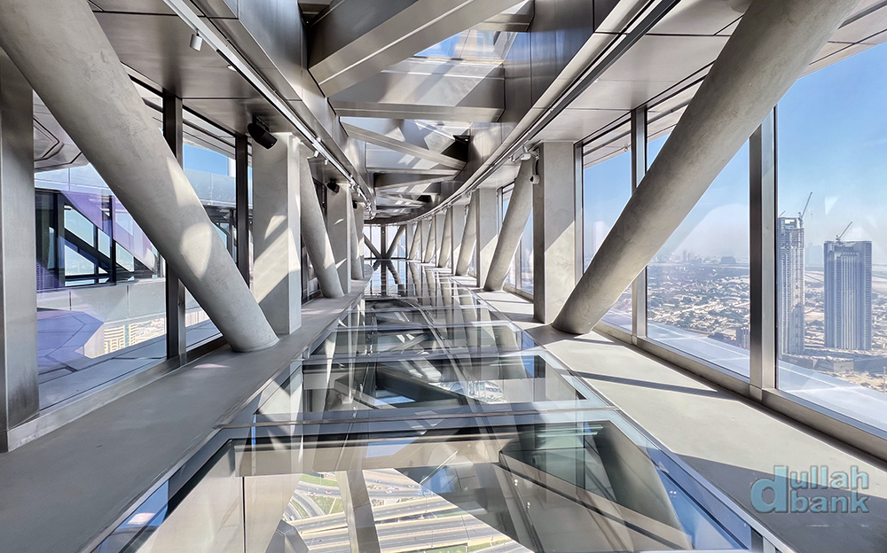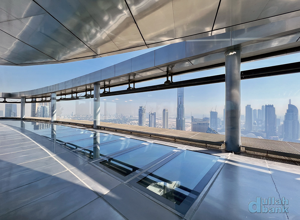 두바이 프레임보다 높은 곳에 자리잡은 이 유리 바닥은 불투명 차단막 없이 상시 밑을 볼 수 있습니다.