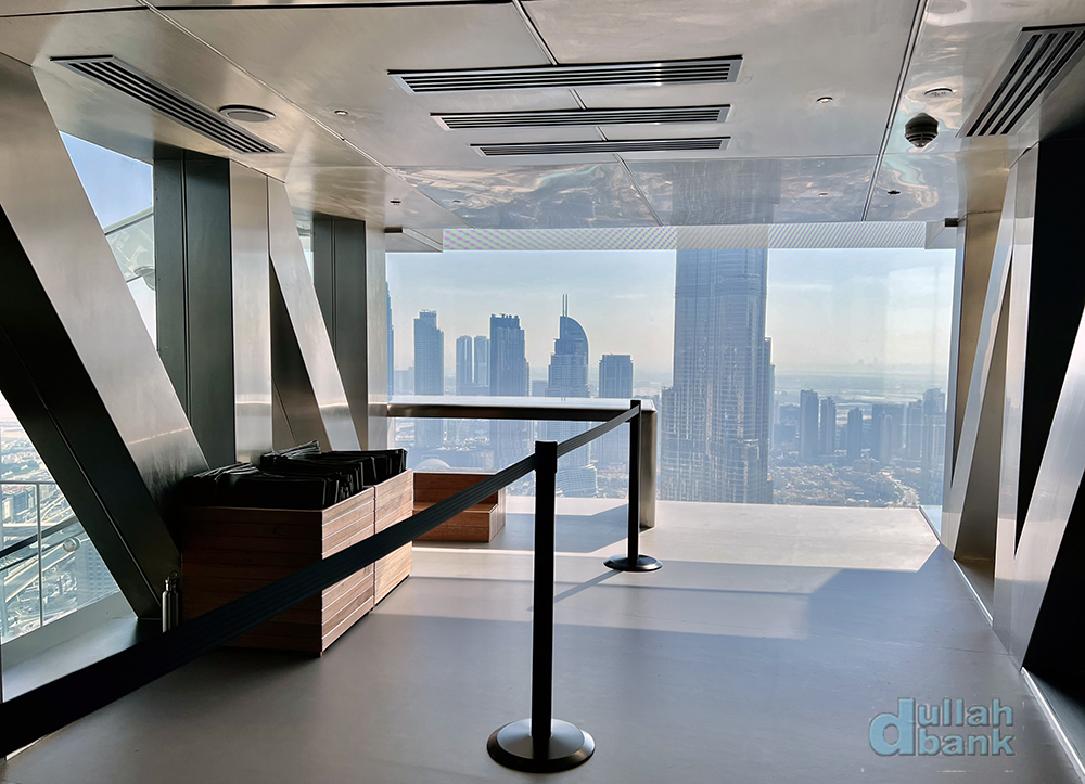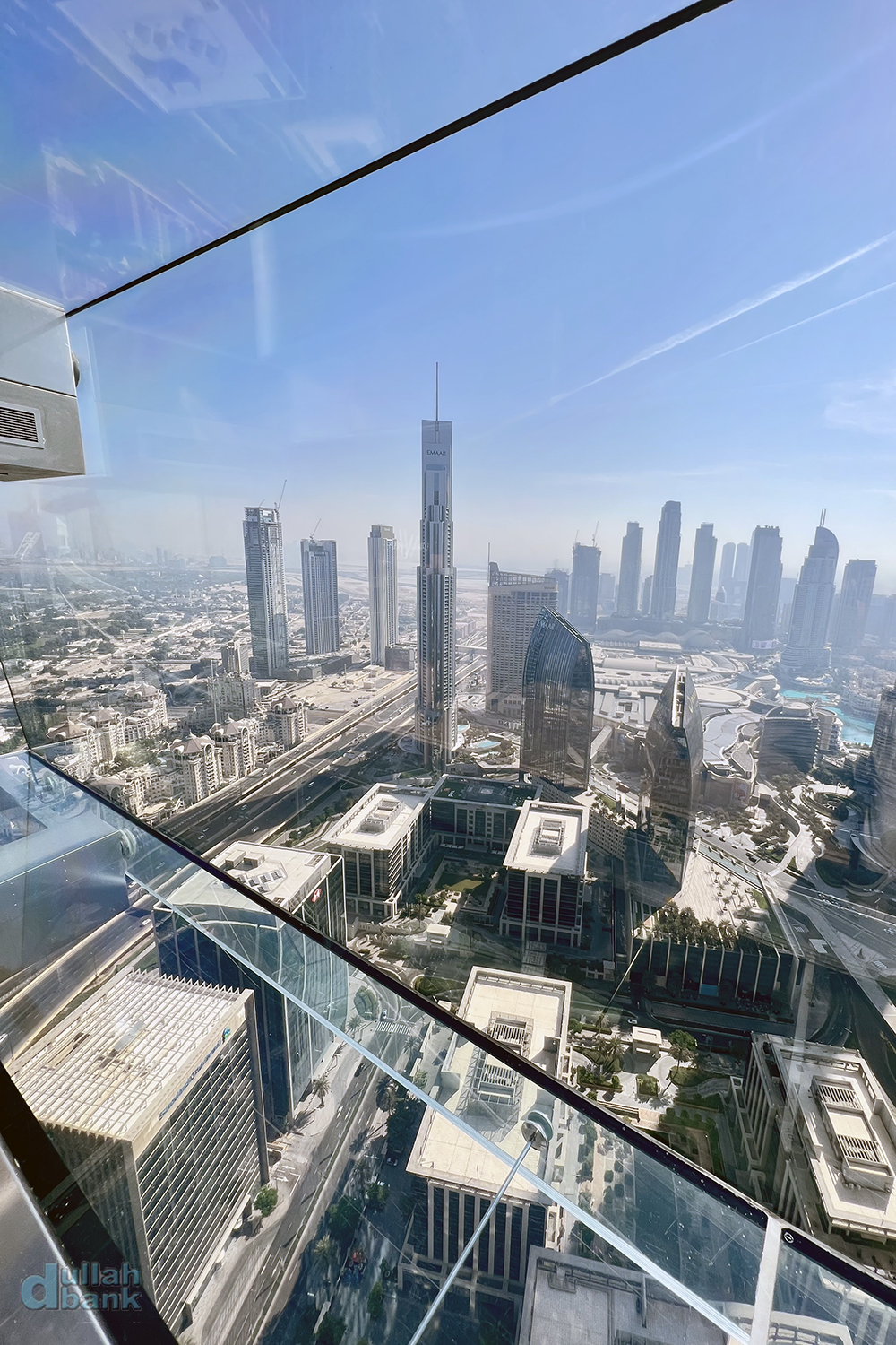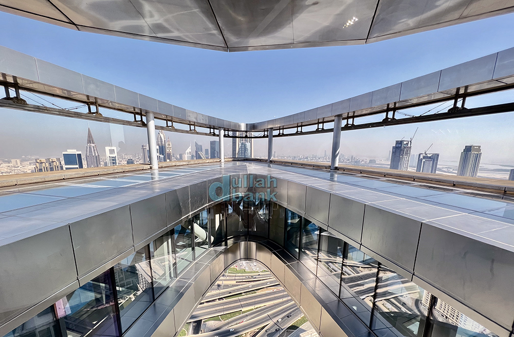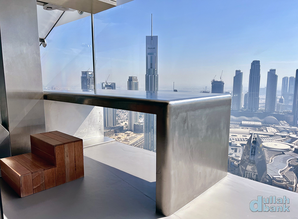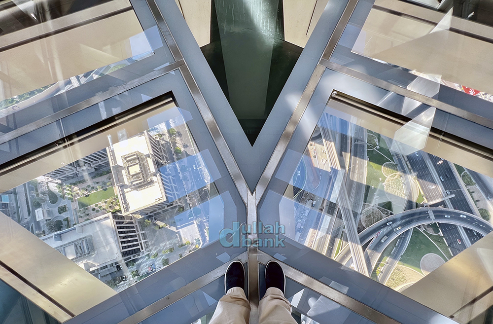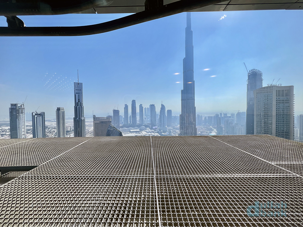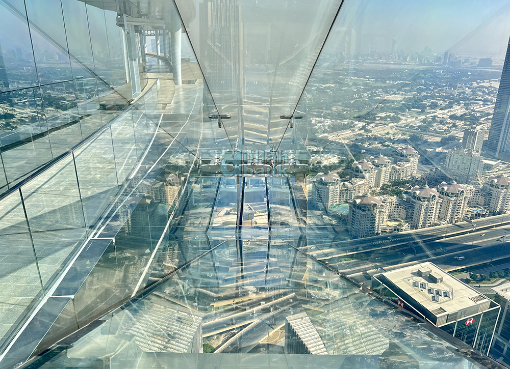 두바이 프레임보다 높은 곳에 자리잡은 이 유리 바닥은 불투명 차단막 없이 상시 밑을 볼 수 있습니다.