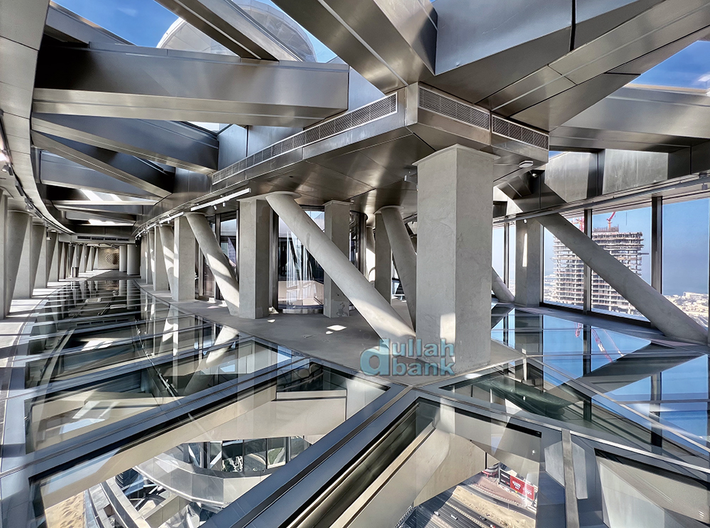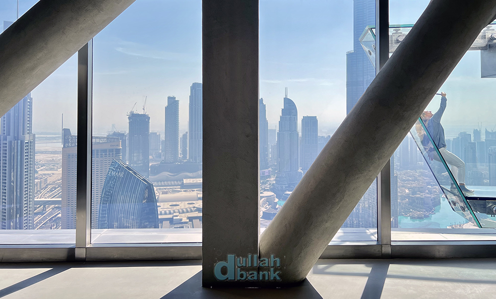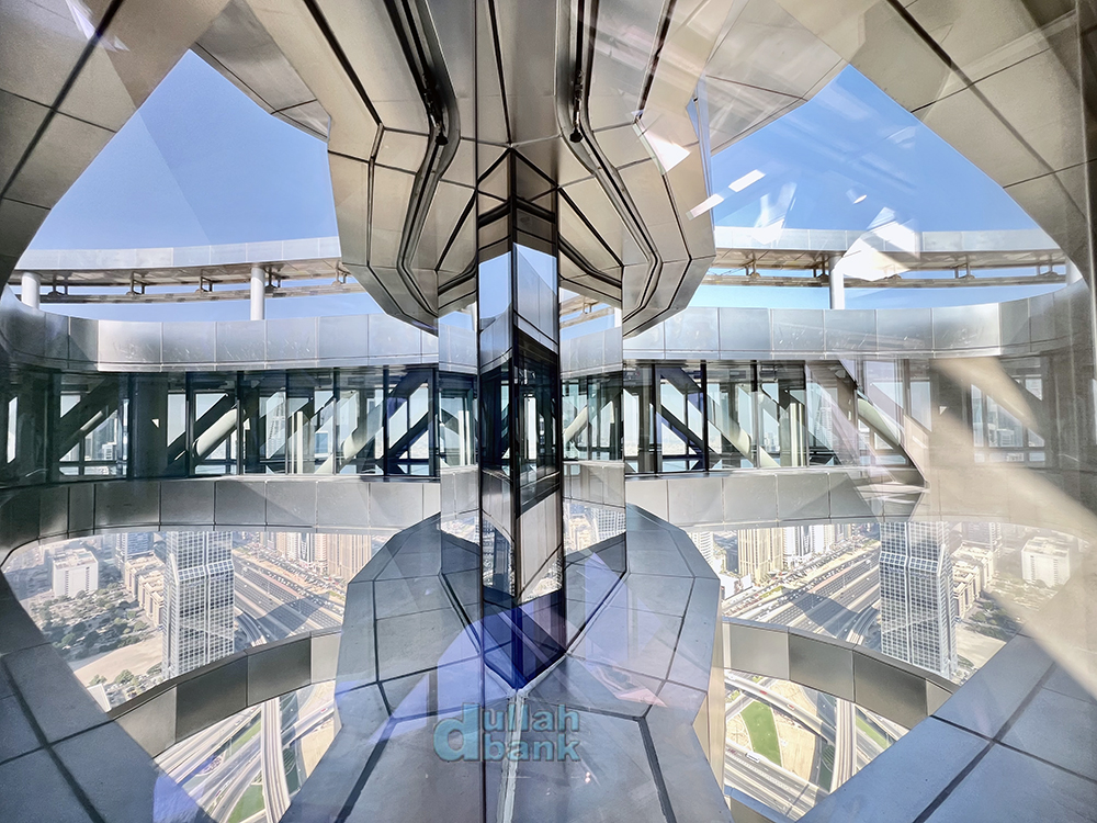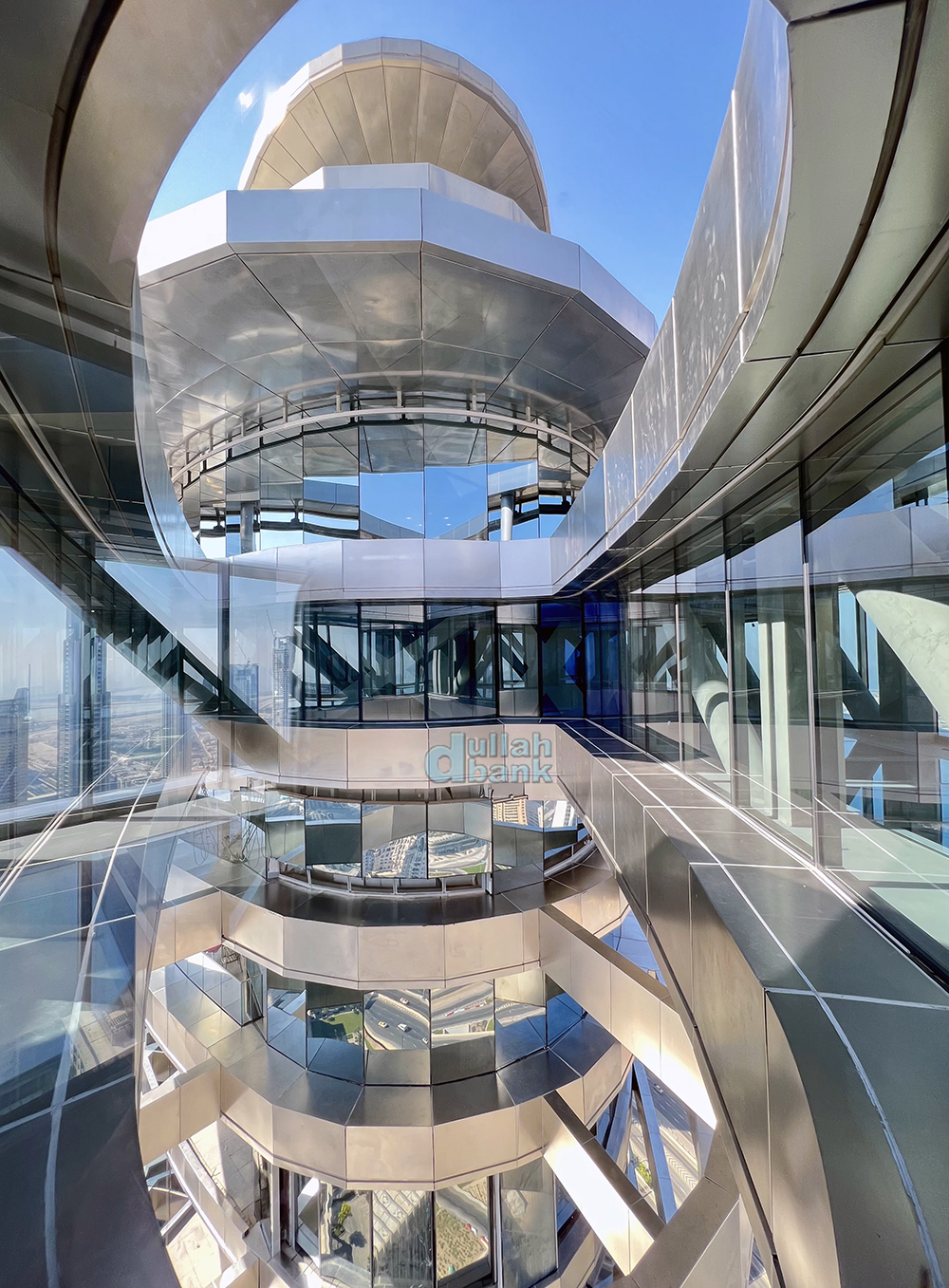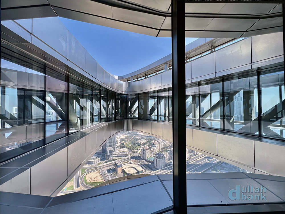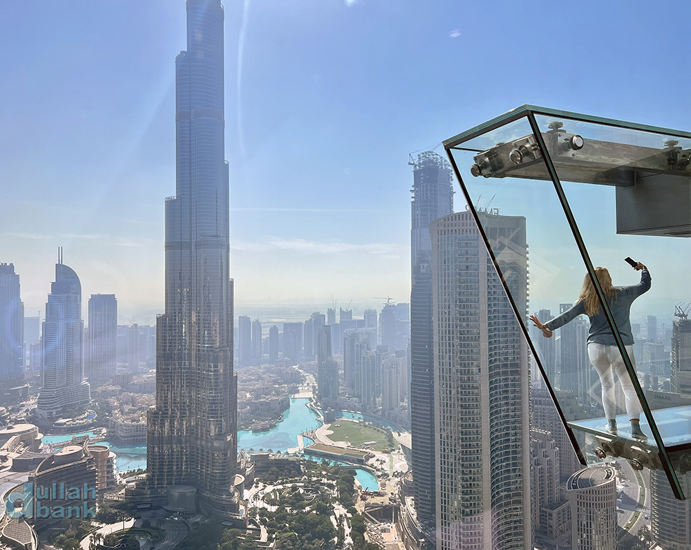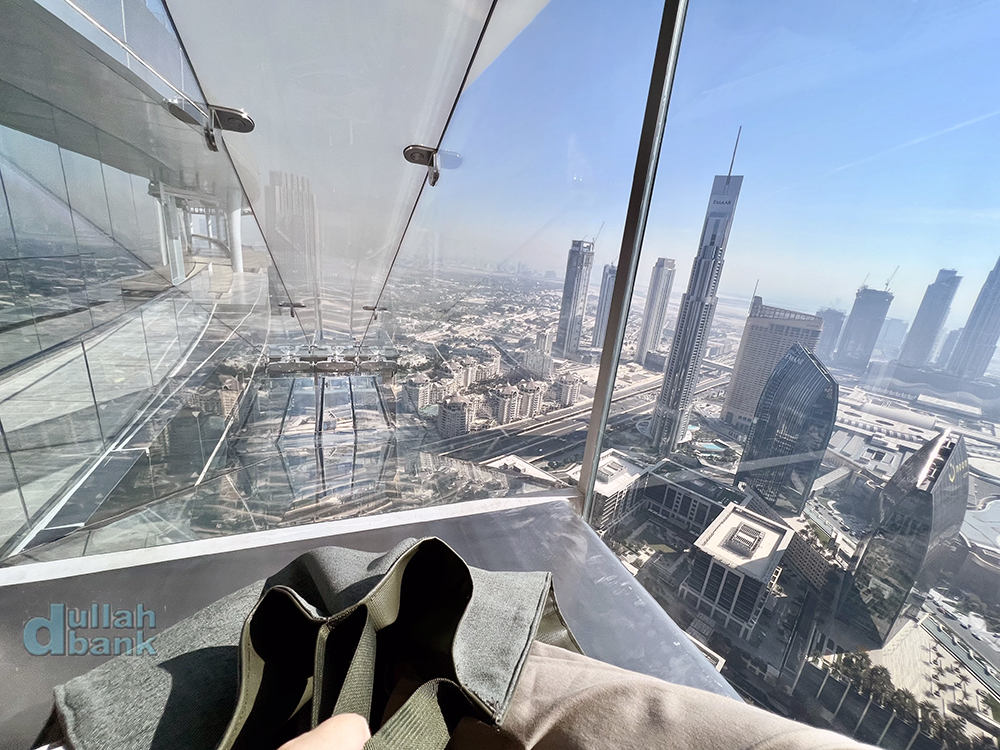 두바이 프레임보다 높은 곳에 자리잡은 이 유리 바닥은 불투명 차단막 없이 상시 밑을 볼 수 있습니다.