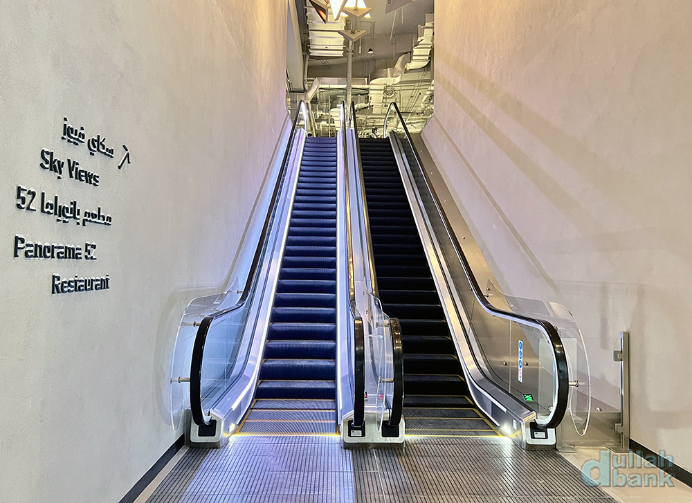 검색대를 통과하면 타워 1동에서 2동으로 이어지는 긴 통로를 거쳐 53층에 올라가기 위한 엘리베이터를 타게 됩니다.