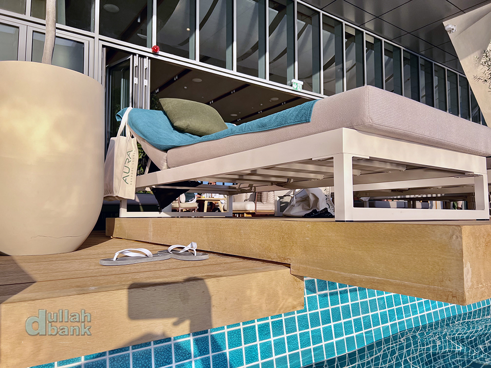 오전 10시부터 일몰시까지 운영되는 오라 스카이풀은 특이하게 오전, 오후, 종일의 3개 시간대와 뷰에 따라 입장비가 다릅니다. 해가 지는 풍경을 가장 잘 볼 수 있는 아인 두바이 뷰의 입장비가 가장 비싸고, 부르즈 알아랍과 대기 상태가 좋으면 부르즈 칼리파와 그 일대 스카이 라인 뷰를 볼 수 있는 부르즈 뷰가 가장 쌉니다. 특히 부르즈 뷰는 다른 뷰와 달리 선베드가 1열 밖에 없는데, 이는 오후 시간대엔 완전히 그늘진 지역이 되어 인기가 없기 때문입니다.
