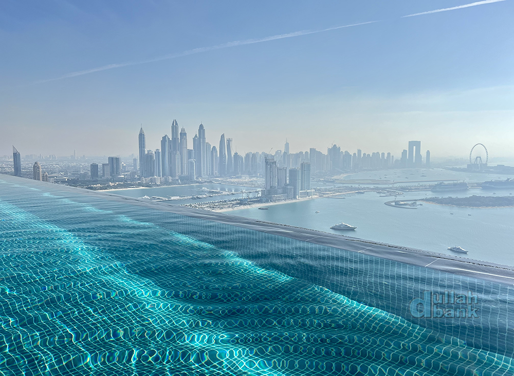 그리고 지난 11월 15일 두바이에 올해 문 여는 마지막 스카이 풀로 팜 주메이라에 자리잡은 아우라 스카이 풀이 공식 개장했습니다. 일반적인 인피니티 풀과 마찬가지로 스카이 인피니티 풀하면 연상되는 싱가포르 마리나 베이 샌즈 인피니티 풀이나 어드레스 비치 리조트 인피니티 풀이 높이면에서는 훨씬 위에 자리잡고 있으면서도 풀이 한쪽 방향을 향해 있는 것과 달리,