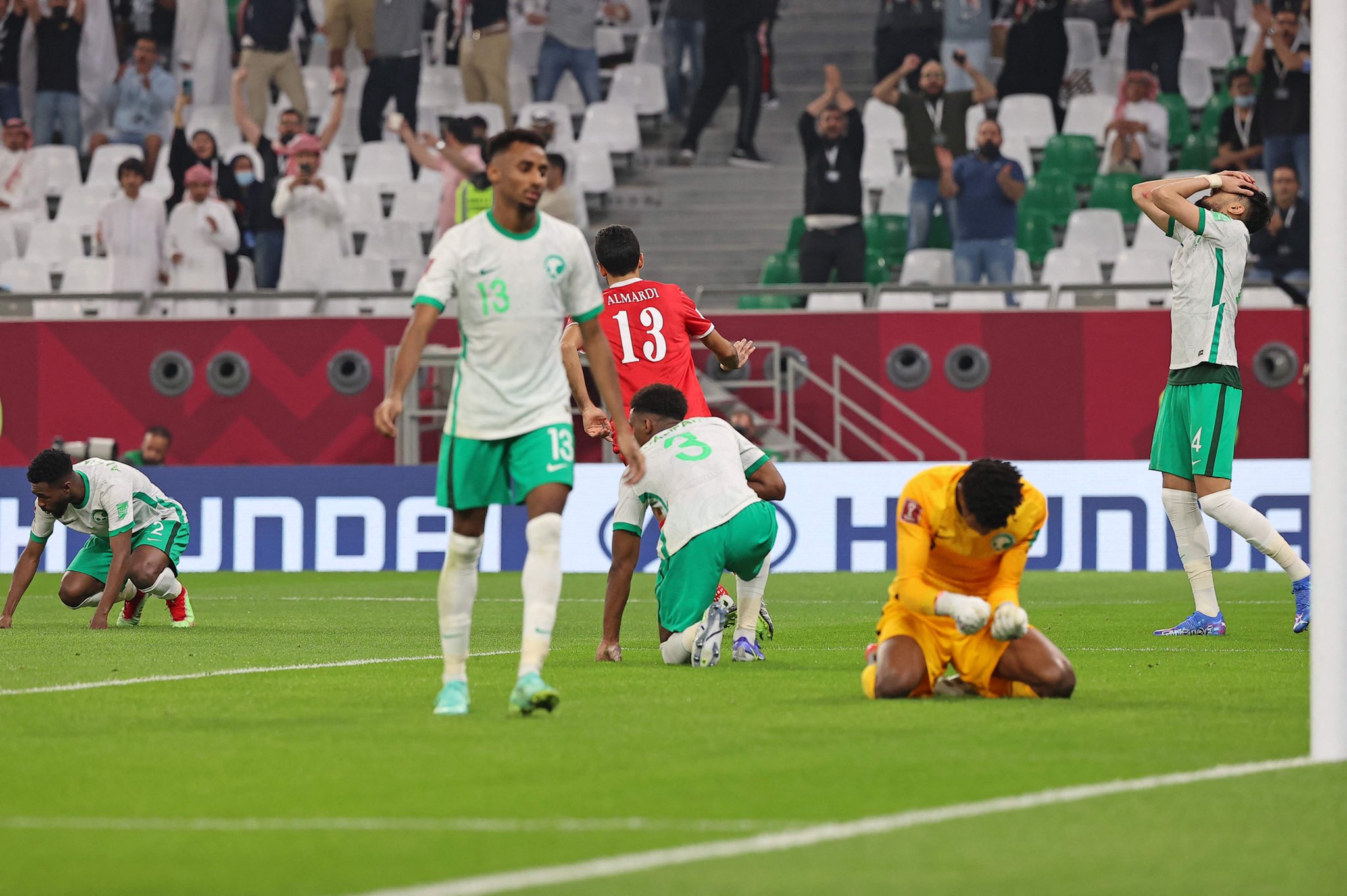 6) 요르단은 A매치 경험이 거의 없는 선수들로 구성된 사우디와의 경기에서 맹공을 펼친 끝에 수적 열세 상황 속에서 터진 칼리파 알도사리의 자책골로 0대1 승리를 거뒀습니다. 사우디 수비수 칼리파 알도사리는 어설픈 볼처리로 자책골을 넣은데 이어 경고누적으로 퇴장 당하면서 그나마 있었던 수적 우세도 무위로 만드는 최악의 경기를 펼쳤습니다.