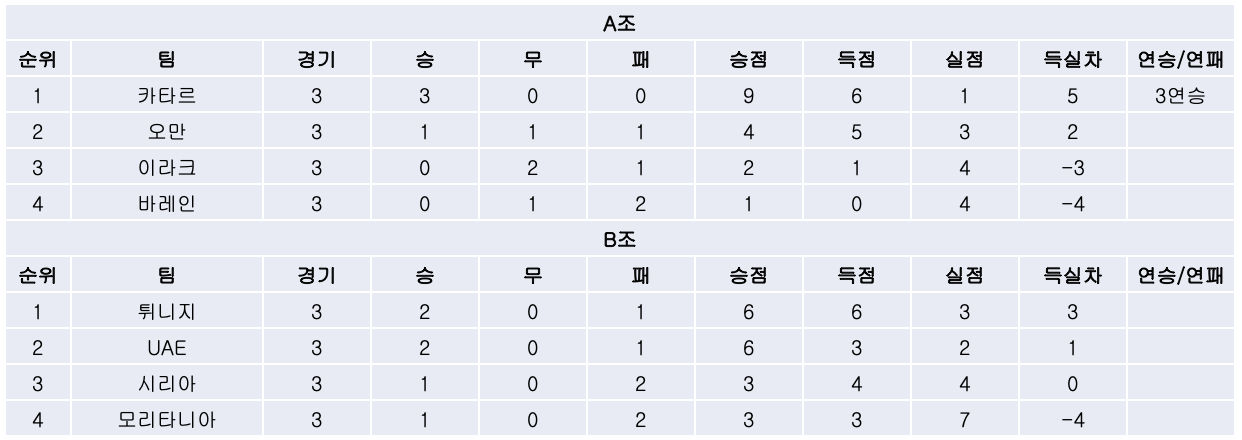 1) 2007년 평가전 후 14년만에 만난 튀니지와 UAE의 경기에서는 전반 초반에 터진 사이풋딘 자지리의 결승골을 잘 지킨 튀니지가 1대0으로 승리하면서 패한 UAE와 승점은 같지만 다득점과 골득실에서 앞서 조1위로 8강에 진출했습니다. 튀니지로서는 모리타니아전에서의 다득점 승리가 도움이 되었으며, UAE는 부상으로 인한 간판 골잡이 알리 마브쿳 결장의 영향을 받은듯 임팩트없는 경기 끝에 또다시 튀니지를 상대로 1패를 추가했지만 모리타니아가 시리아를 꺾으면서 간신히 조2위로 8강에 진출했습니다.