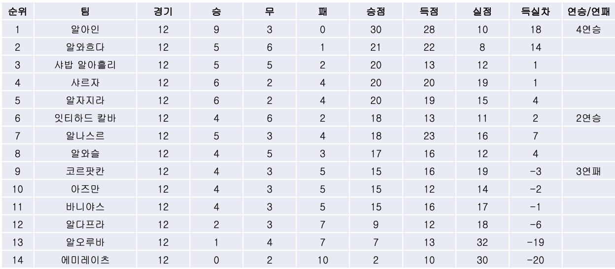 | [21/22 APL 9R] 알아인의 선두 질주, 3연승을 달리며 드디어 2위에 올라선 알와흐다! (0) | 2021.11.04 |