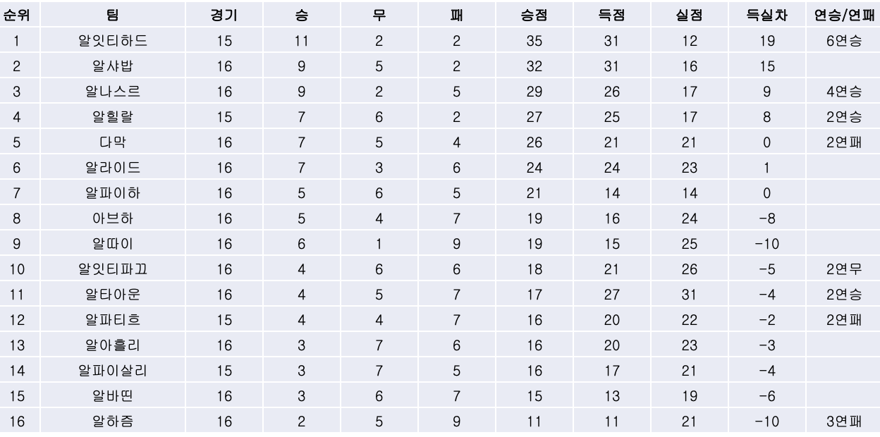 2) 선두 알잇티하드는 개막전에서 패배를 안겨줬던 알파이하와의 리턴 매치에서 오마르 하우사위의 결승골과 로마리뉴의 쐐기골을 묶어 2대0으로 완파하고 6연승을 달리며 선두를 질주했습니다. 반면 네 경기 연속 무승부를 기록 중이던 알파이하는 다섯 경기 만에 패배를 기록했습니다.