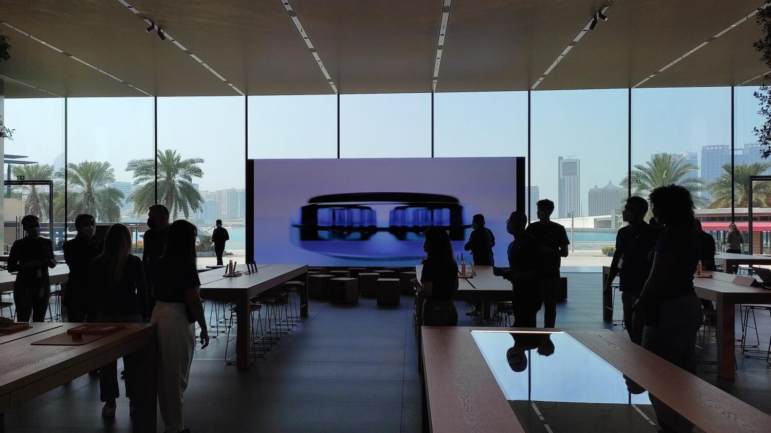 이번에 문을 열게 된 애플 알마르야 아일랜드는 현재 영업 중인 UAE 내 애플 스토어들과 달리 물이 흘러내리는 검은색 화강암 계단 위에 독립적인 건물로 자리잡은 것이 특징입니다.