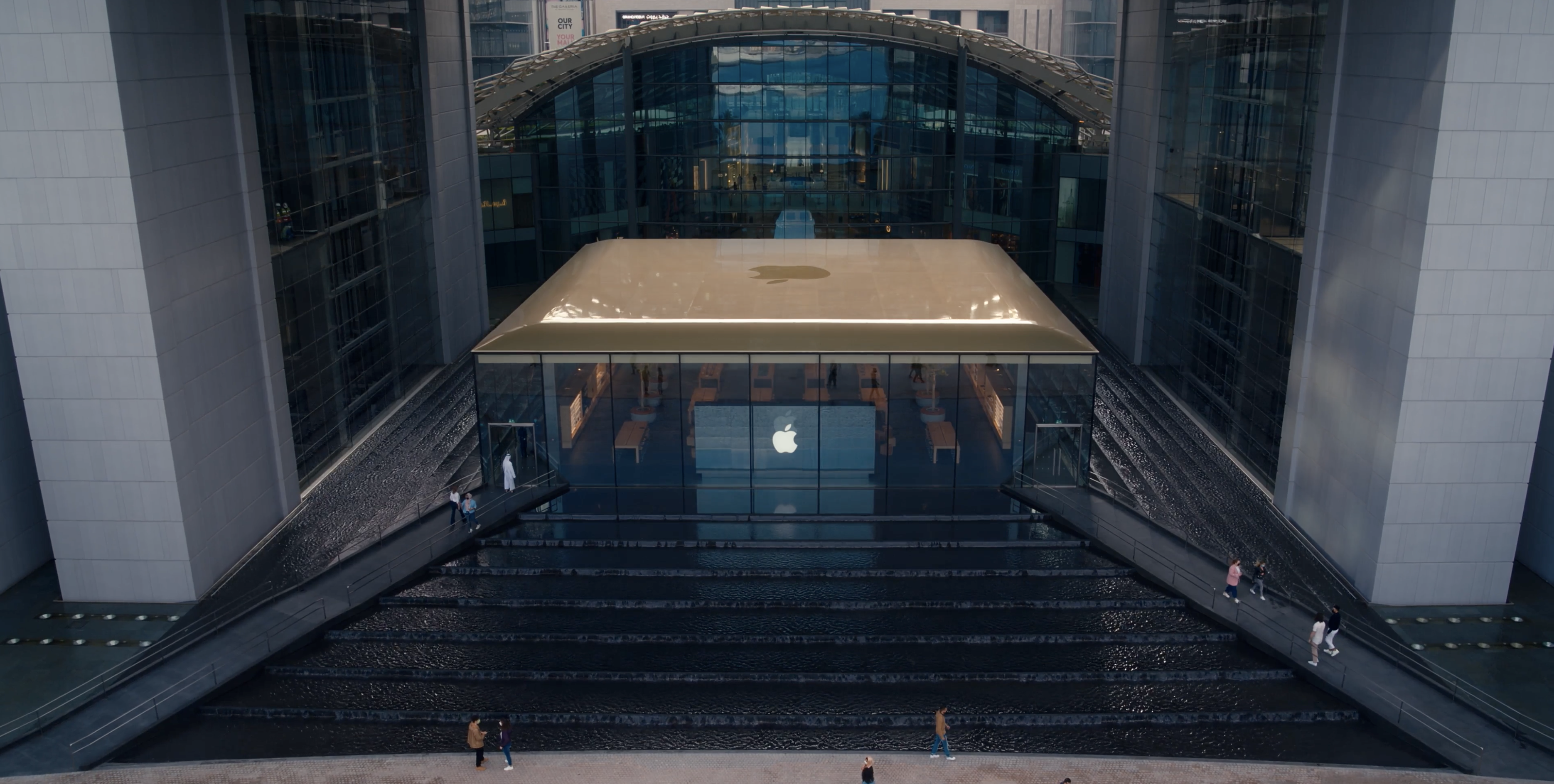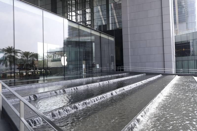 이번에 문을 열게 된 애플 알마르야 아일랜드는 현재 영업 중인 UAE 내 애플 스토어들과 달리 물이 흘러내리는 검은색 화강암 계단 위에 독립적인 건물로 자리잡은 것이 특징입니다.