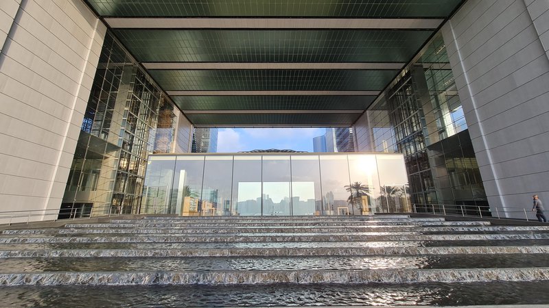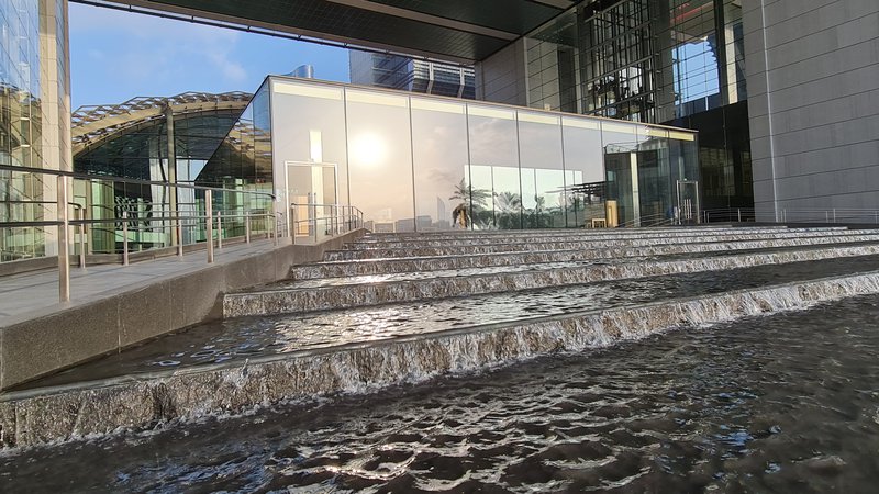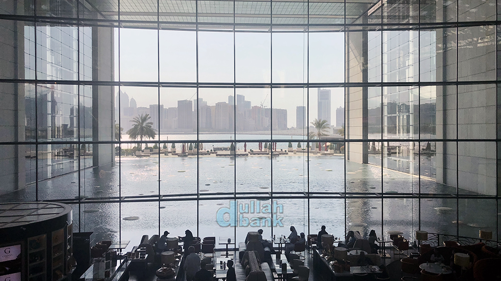왠 물이 흐르는가 싶겠지만, 원래 이 공간은 물이 차지하던 공간이었습니다. 수면과 양 옆의 유리 반사를 활용해 아부다비의 스카이 라인을 조망할 수 있는 공간이었죠.