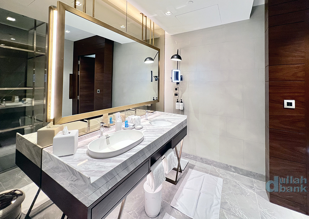 세면대는 세면대에 설치된 거울과 이를 액자처럼 보이게 만드는 대형 전신 거울이 이중으로 배열되어 있습니다.