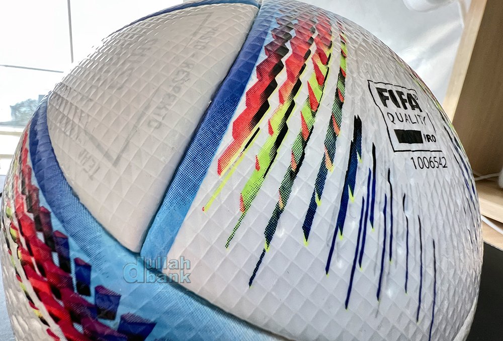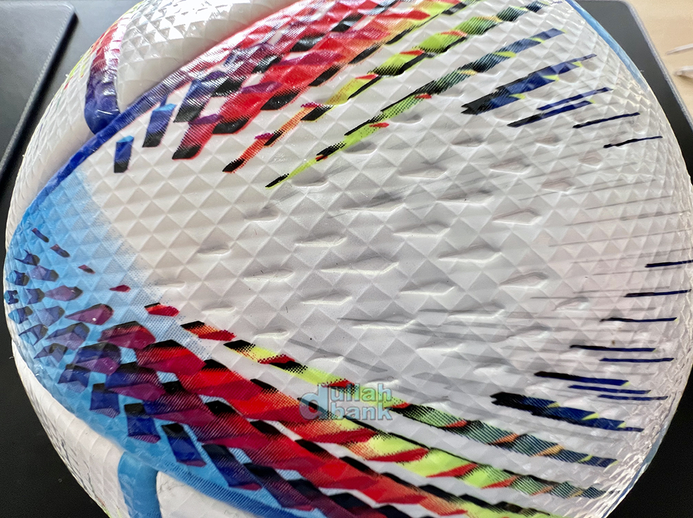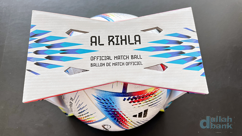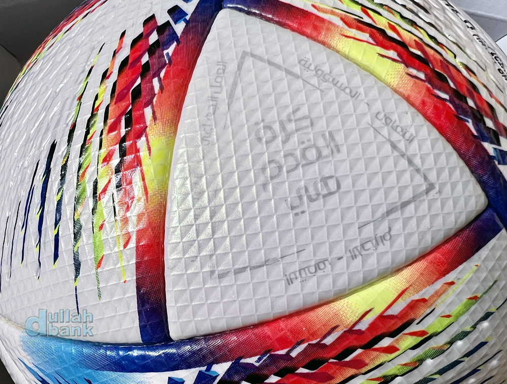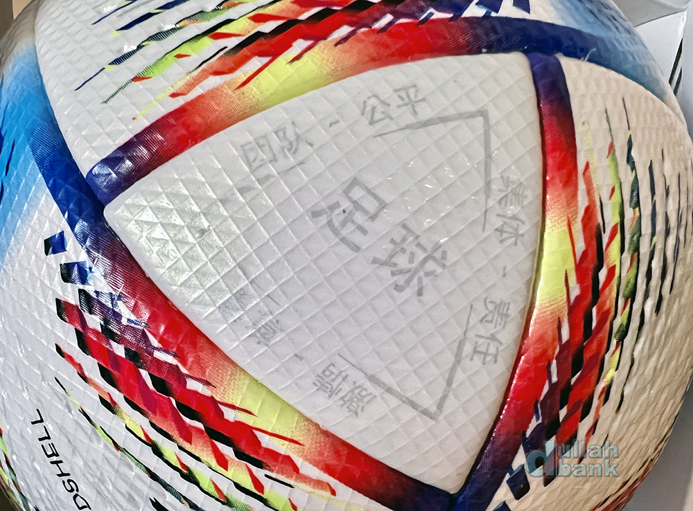 한쪽에는 카타르 월드컵 로고, 아디다스 로고와 함께 써말 본딩으로 접착했다는 설명과 공인구와 같은 크기와 무게의 5호구라는 설명이 있으며,