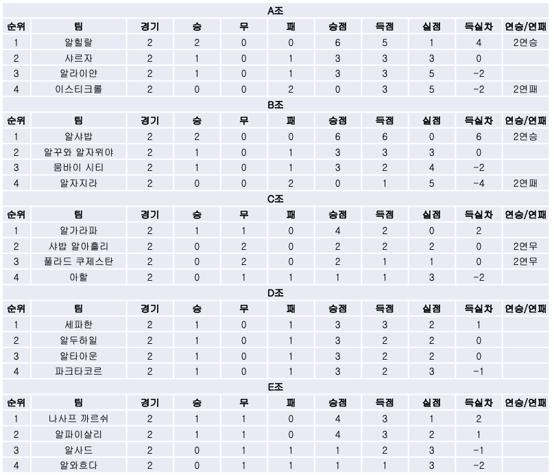 1) 나사프 까르쉬는 알와흐다와의 경기에서 마르코 스타노제비치의 멀티골에 힘입어 2대0으로 승리하고 E조에서 첫 승을 거둔 팀이 되었습니다.
