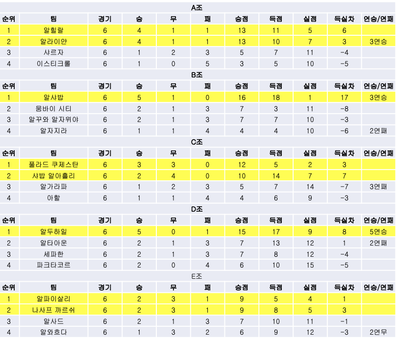 1) 조 1위에 도전한 나사프 까르쉬와 조 2위에 도전한 알와흐다와의 경기에서는 네 골을 주고받은 끝에 모한나드 아부 타하의 동점골로 2대2 무승부를 거두고 승점 1점씩을 나눠가지며 조별예선을 마무리했습니다. 나사프 까르쉬는 승점 9점으로 조2위를 차지하며 마지막 16강행 막차 티켓을 끊었습니다.